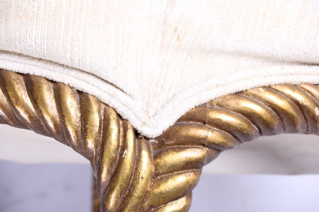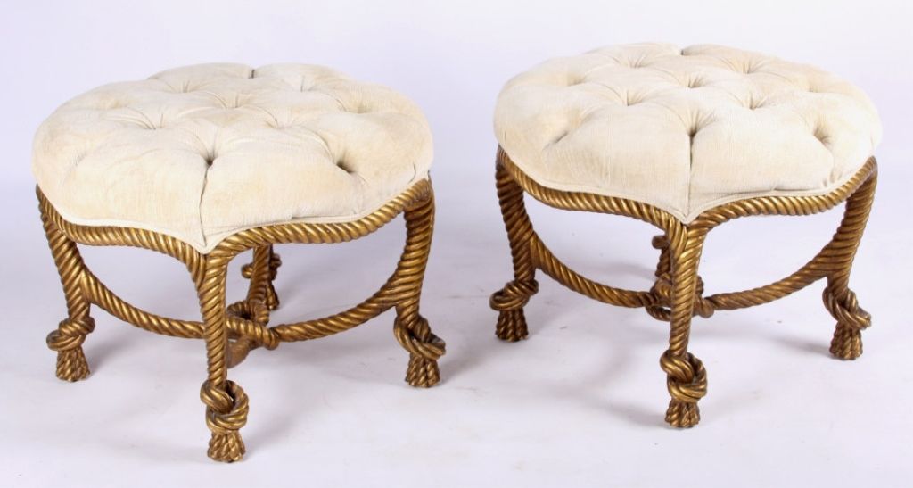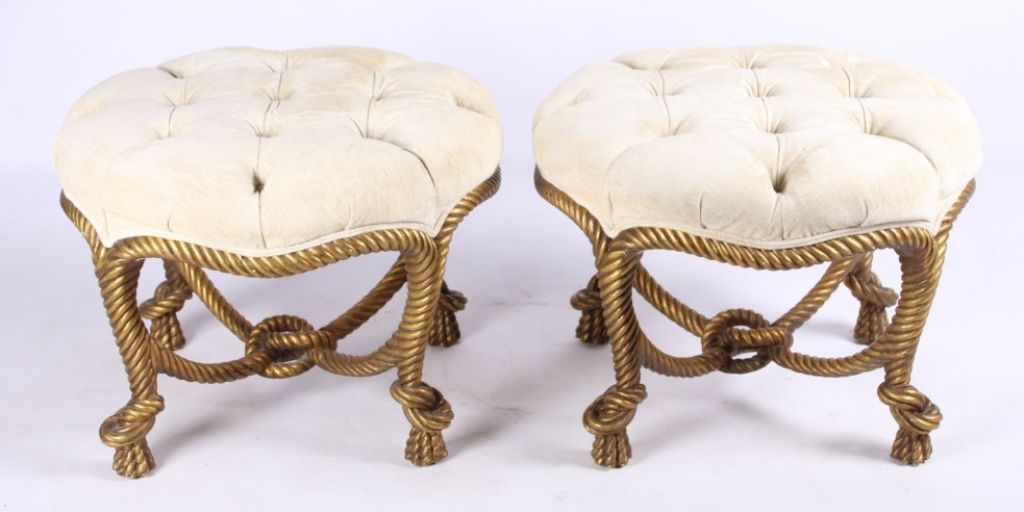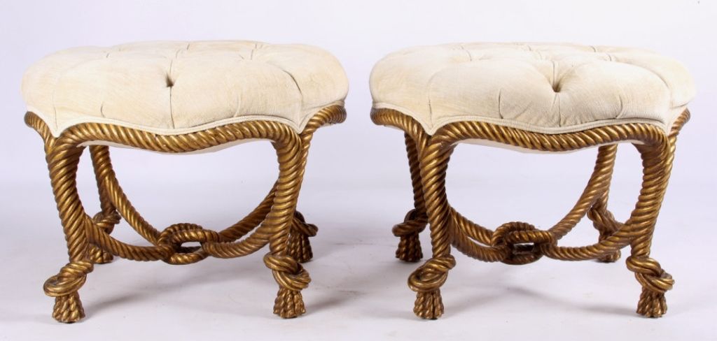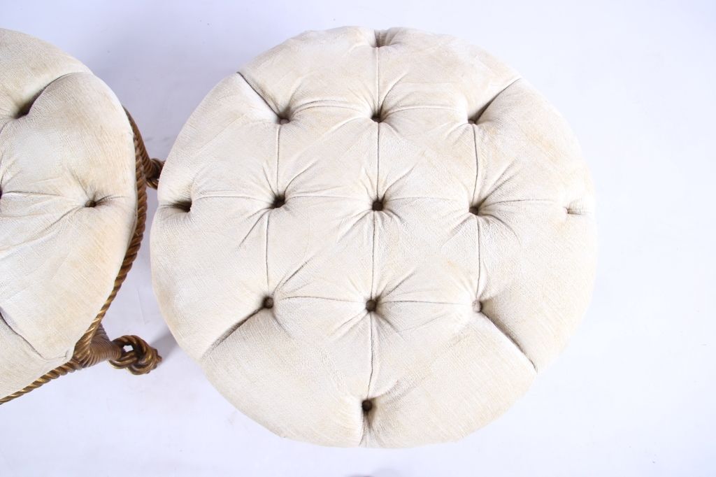 The lot features a set of original Napolean III Gilt Wood rope stools. The stools or ottomans feature a French carved gilt wood design after the model by A.M.E. Fournier during the 19th century. The piece has afabric round top with pulled buttons and a twisted rope design for the legs which ties into the center. These are very rare and desirable and have sold for well over $5,996 at auction per stool. Measures 25" diameterand 19" tall.