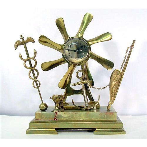 Ship doctor desk set. French, Industrial timepiece with ships, capstan with a compass, apthec, anchor with thermometer, and eight day cylinder escapement. Paper weight crystal. Solid brass , green marble , AND the symbol of the medicine :The Caduceus ,winged staff with two snakes wrapped around it ,associated with the Greek god Hermes, the messenger for the gods, In the seventh century, the caduceus came to be associated with a precursor of medicine, based on the Hermetic astrological principles of using the planets and stars to heal the sick , Clock movement cleaned and oiled. Museum quality item very rare, .Sold by a jeweller out of New York , singed on dial, is A PERFECT gift for a Doctor !!!