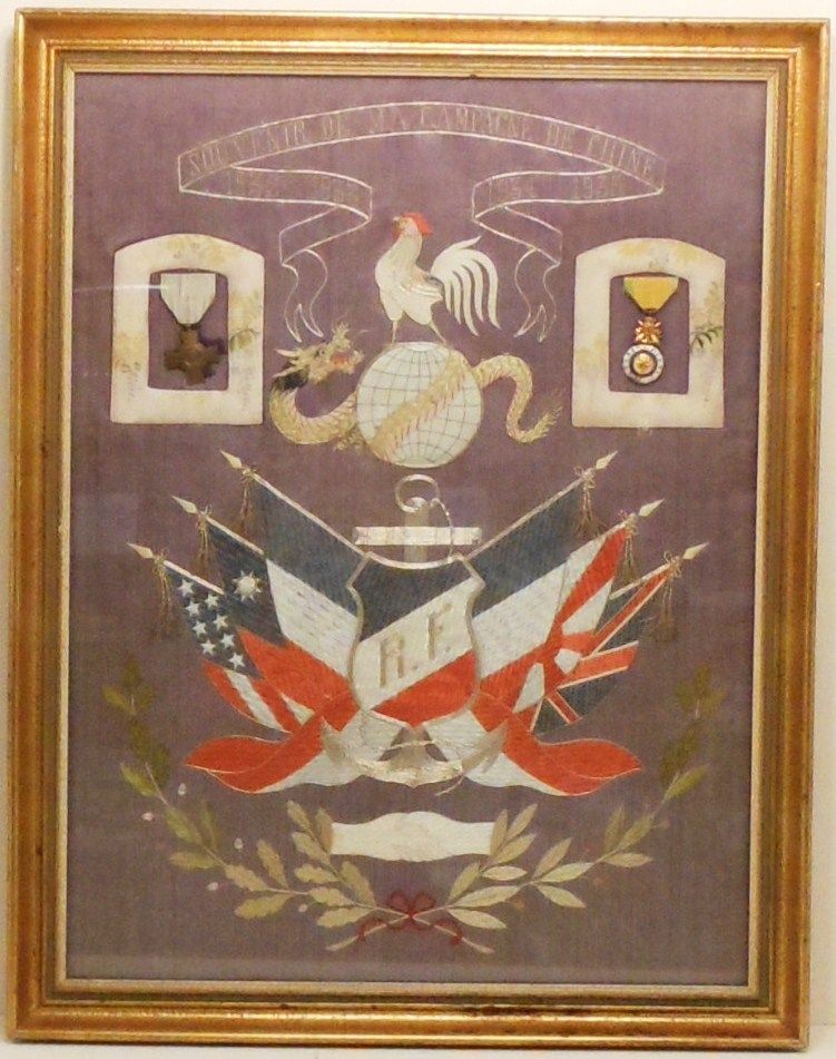 18" x 25" memorial silk mounted, framed and under glass, embroidery on silk of a unnamed French Sailor's "Souvenir De Ma Campagne De Chine 1932 1933 1934 1935", decorated with a dragon encircling the world with a rooster atop it, two French Medal have cloth frames, French shield incorporated with an anchor with the initials R.F. on a background of six nations flags, below two hands shaking with oak and laurel branches. Excellent condition, frame has a few dings.