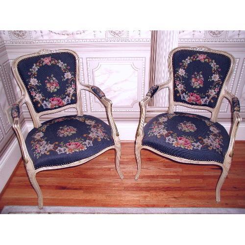 Pair of medium blue needlepoint Louis XV French chairs 19th century. Floral design worked in pink,rose,yellow,green,rust with a tiny petti point floral center motif on back and seat in like colors. Deep antique cream frame with floral carving on the back and knees. Escargot feet. Gilt trim on the arms. Brass nail-head trim surrounds outline. Padded arm rests. Sturdy and comfortable. Small bit of fabric pulled out of frame on solid blue velvet back of one,see photo,otherwise excellent condition.Under top frame so does not show unless eye level with chair frame. Needlepoint in superior condition. Measure 33.5H X 21D X 22.25L. Price is for pair. Seat 16.5 inches from floor.