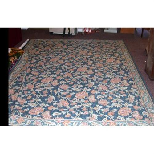 A fabulous French needlepoint from the late 18th to early 19th century, 11 feet and 11 1/2 inches by 8 feet and 11 1/2 inches. The intricate stitching creates a beautiful all-over floral pattern with a soft blue background, peach flowers and pale green leaves. There is some slight wear, but otherwise the tapestry is in excellent condition.