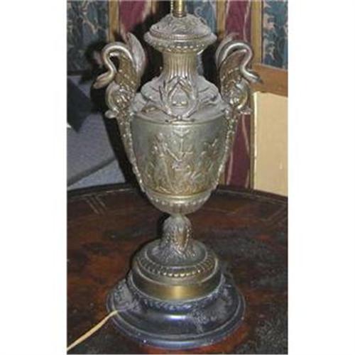 This old French urn-shaped table lamp features fine neoclassical figural designs on each side and three-dimensional swans decorate the neck. Measures 35" high to top of finial, 9" wide and 8" deep. Rewired and in good working order. Urn has been reglued to the base. This lamp resides on the upper west side of Manhattan ( New York city ) and may be seen by appointment.