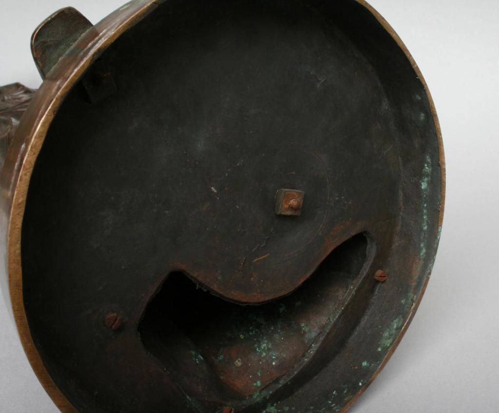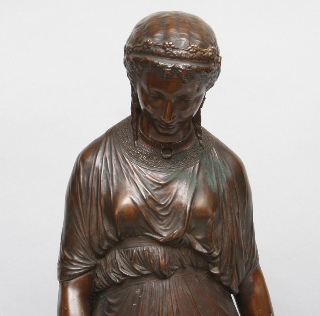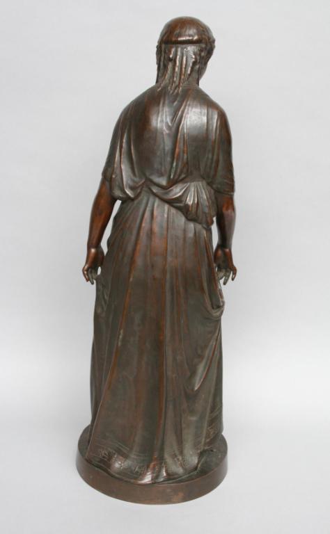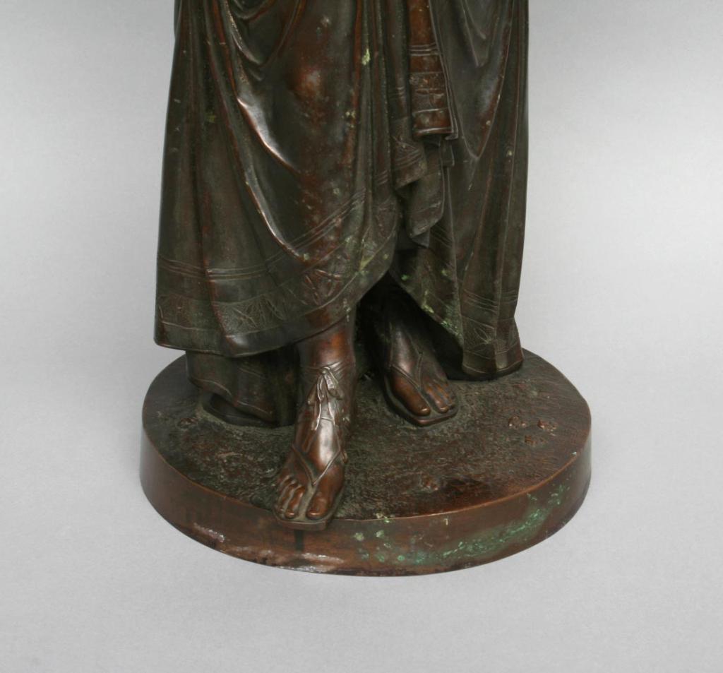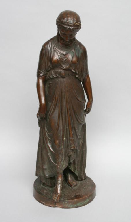 20th century, cast in bronze as a classical style beauty gracefully draped, pointing her sandaled foot forward, , covered in a warm brownish gold patination. 26 1/2"H. 10"W. Condition: some surface imperfections including light verdigris and some light pitting and light discoloration, generally very good.