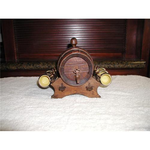 French Oak and Copper Wine Barrel Set. The Barrel has copper Staves and Specket and rests on an oak base. The barrel is marked Eugene Lerouste, Mattre Torrelier, and the base has the number 91 embossed in the oak.6 Porcelain cups accompany the set. They are black with gold bands and the inside is yellow. All cups are in perfect condition. Set is remarkable for it's age. Please look at pictures. I've tried to show all the character of the set. Great decorative item!