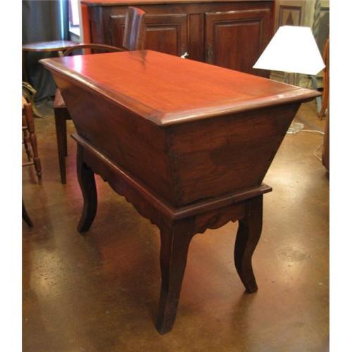 This marvelous piece is from the 18th century and made of solid oak and walnut with cabriole legs. The top slides open to expose ample storage space. This doughbin would be wonderful in a guestroom or bedroom as a side table which could store extra blankets.