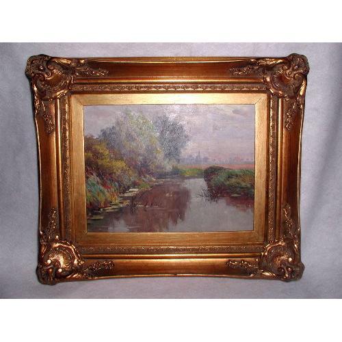 Beautiful coloring in this unsigned French oil on canvas of a French river scene C.1900 Wonderful detail in the strokes. Framed in an antique gold ornate raised frame. Aged sticker on the back of the canvas reads "Encadrements Fournitures Pour Artistes Miroilerie Vierres J. Cardin 47 Rue d'Isly Alger". Excellent condition,new wire on the back . Measures 13.5L X 10H unframed,18.5L X 16.5H X 2 framed.