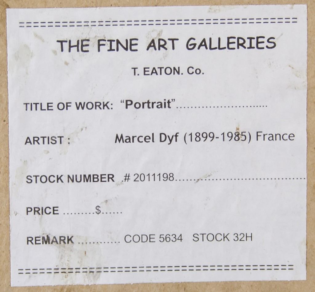 Oil pastel on paper, framed. Featuring portrait of a woman in a white dress. Signed "DYF" to the bottom left corner. Label on verso reads "THE FINE ART GALLERIES / TITLE OF WORK: "Portrait" / ARTIST: Marcel Dyf (1899-1985) France". 50 x 39 cm (20 x 15.25 inches). Frame size: 54 x 56 cm (21 x 22 inches).
