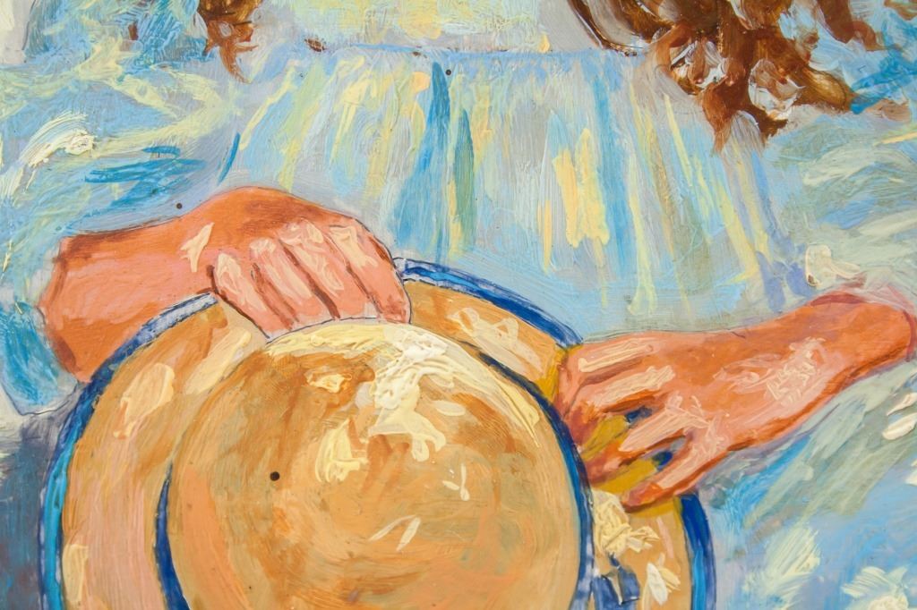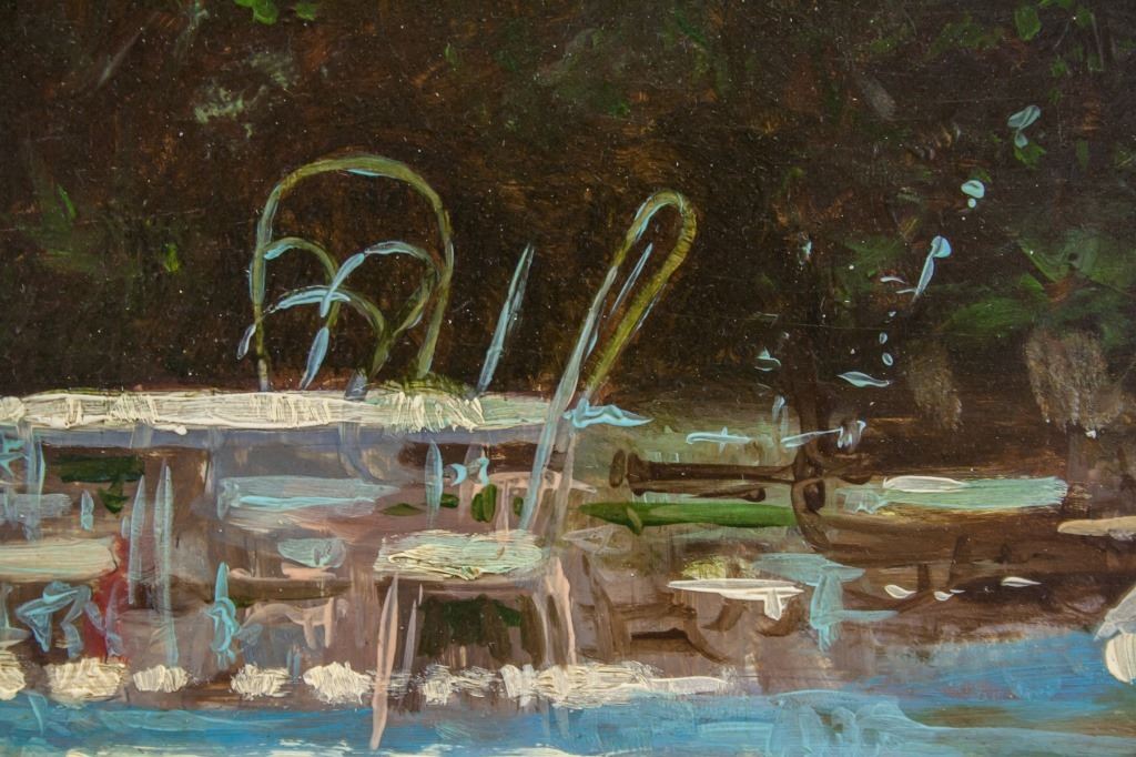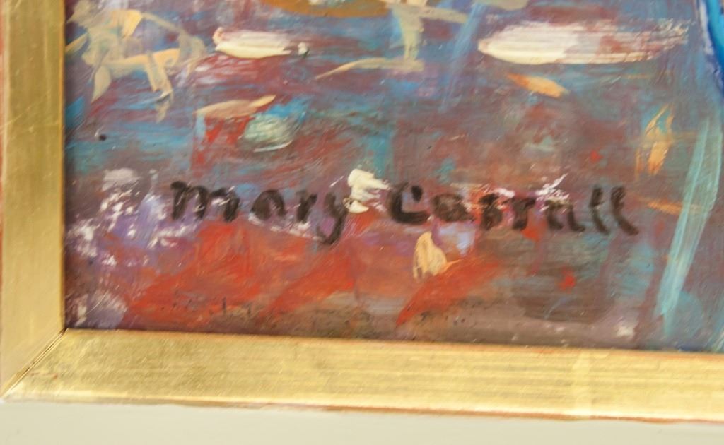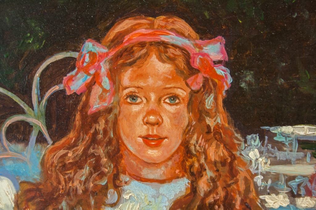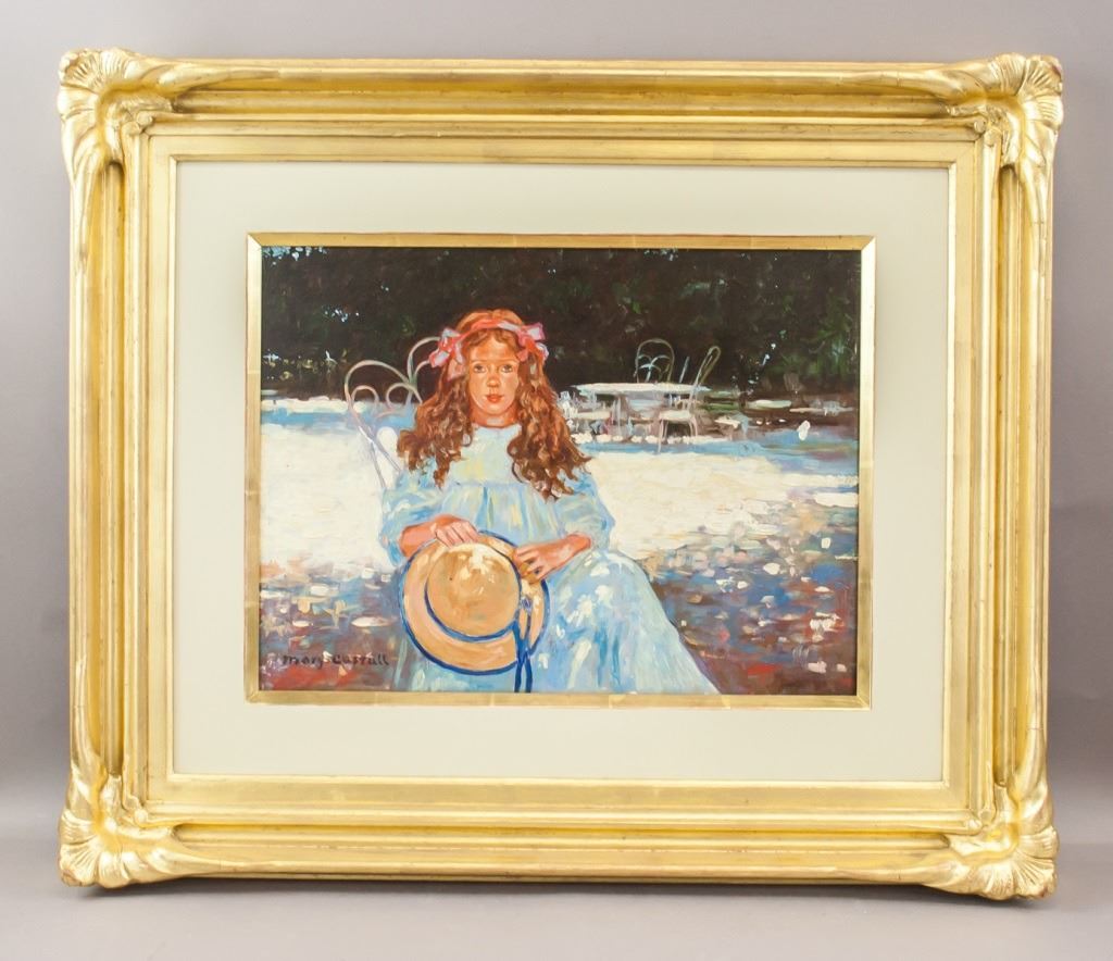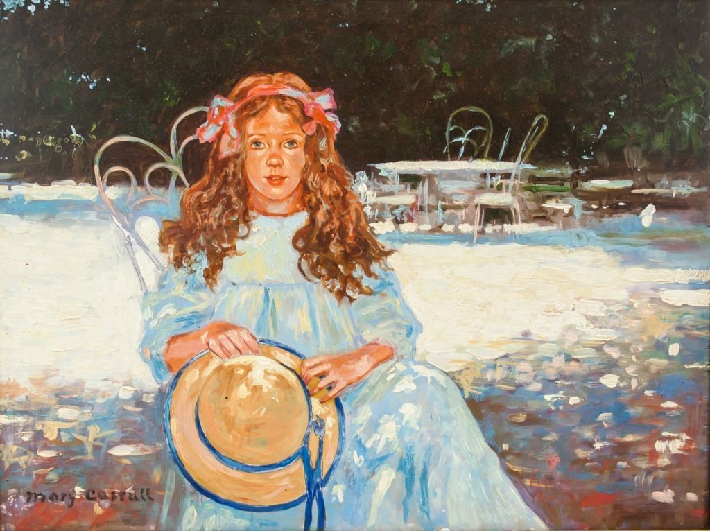 Oil on board, framed. Featuring portrait of a girl in a blue dress with a pink ribbon in her hair, holding a straw hat with blue ribbons. Signed "Mary Cassatt" signed to the bottom left corner. Board size: 28.5 x 38.5 cm (11.25 x 15.25 inches). Frame size: 53 x 63 cm (20.75 x 24.75 inches).