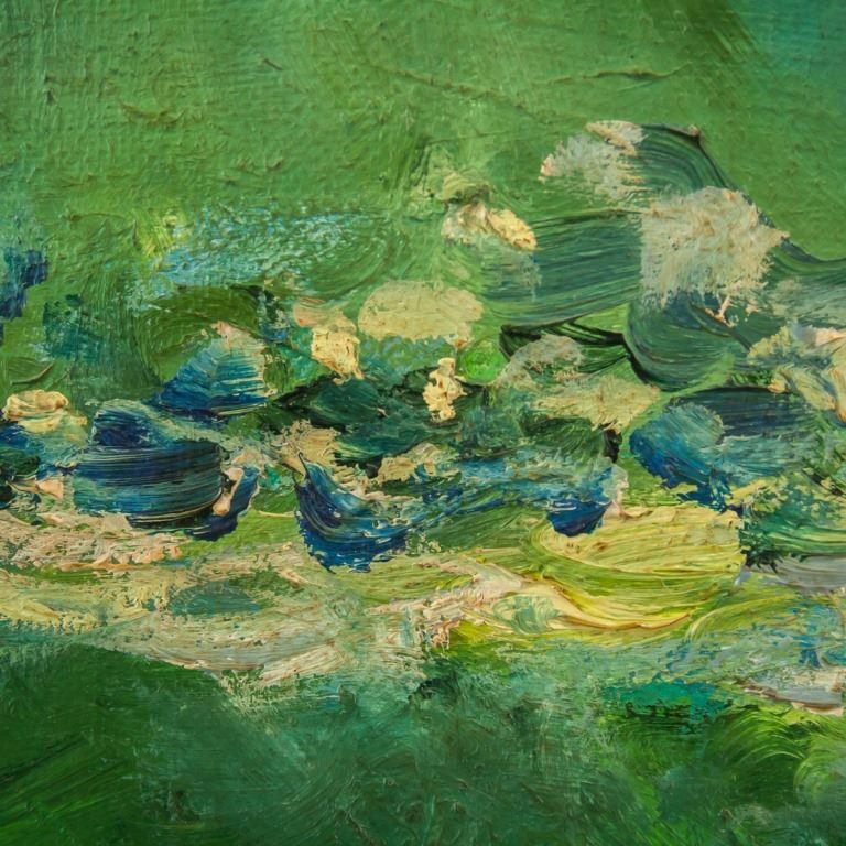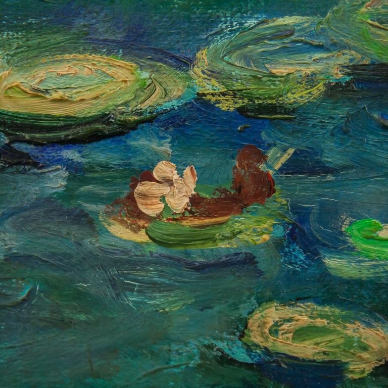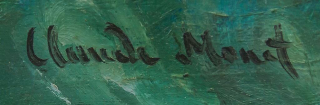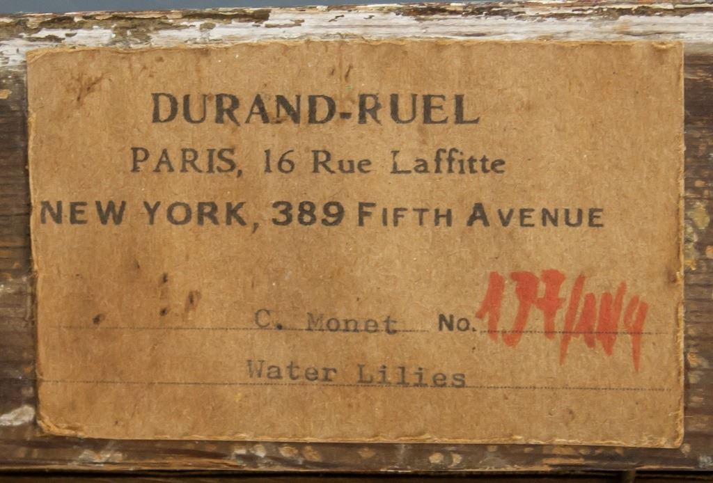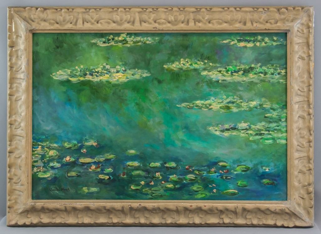 Oil on board, framed. Featuring landscape scene of lily pads. Signed "Claude Monet" to the bottom left corner. Label on verso reads "DURAND-RUEL". Board size: 50 x 75 cm (20 x 29.5 inches). Frame size: 63 x 88 cm (23 x 34.5 inches).