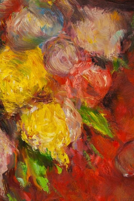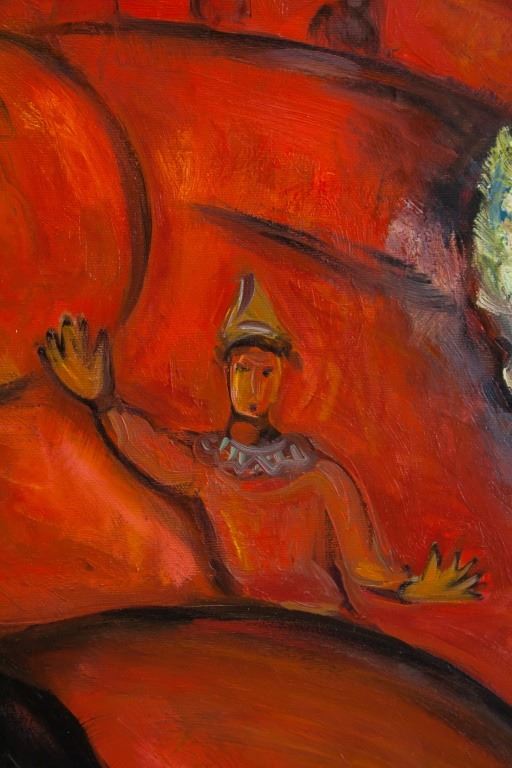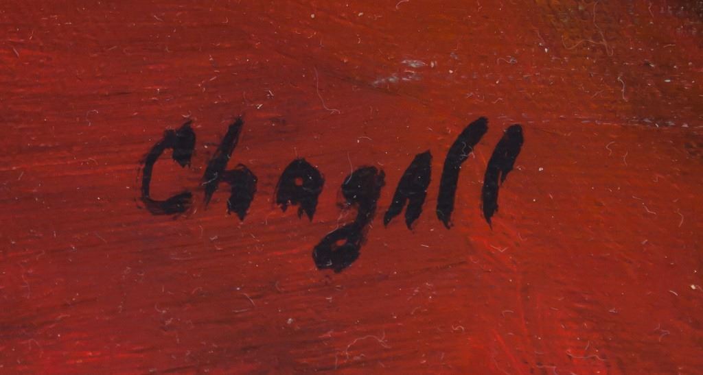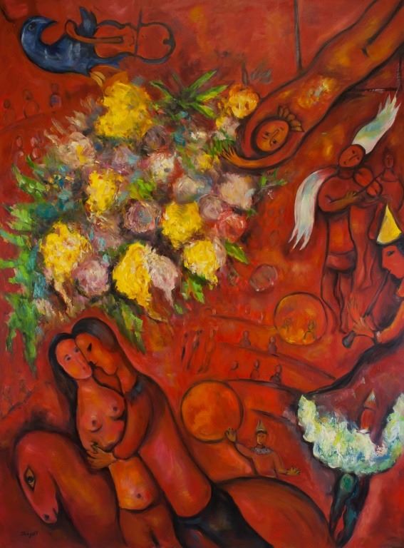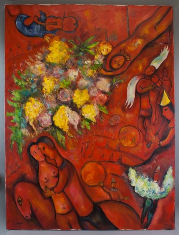 Oil on canvas. Featuring surrealist composition, mainly in red, with a large bouquet near the top left. Signed "Chagall" to the bottom left corner. 122 x 91 cm (48 x 36 inch).