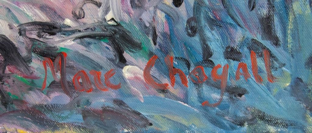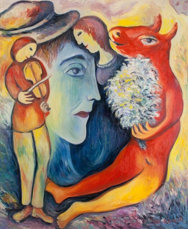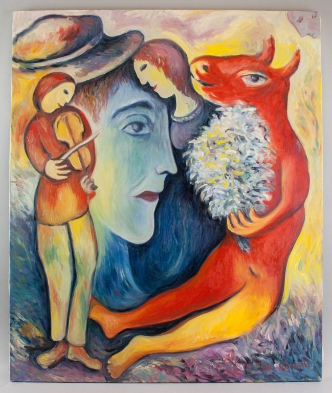 Oil on canvas. Featuring surrealist composition of a red half-cow half-human figure holding a bouquet of flowers with a person playing a violin. In the background, a woman in blue is pressed close to a large face. Signed "Marc Chagall" to the bottom right corner. 95 x 79 cm (37.5 x 31 inches).