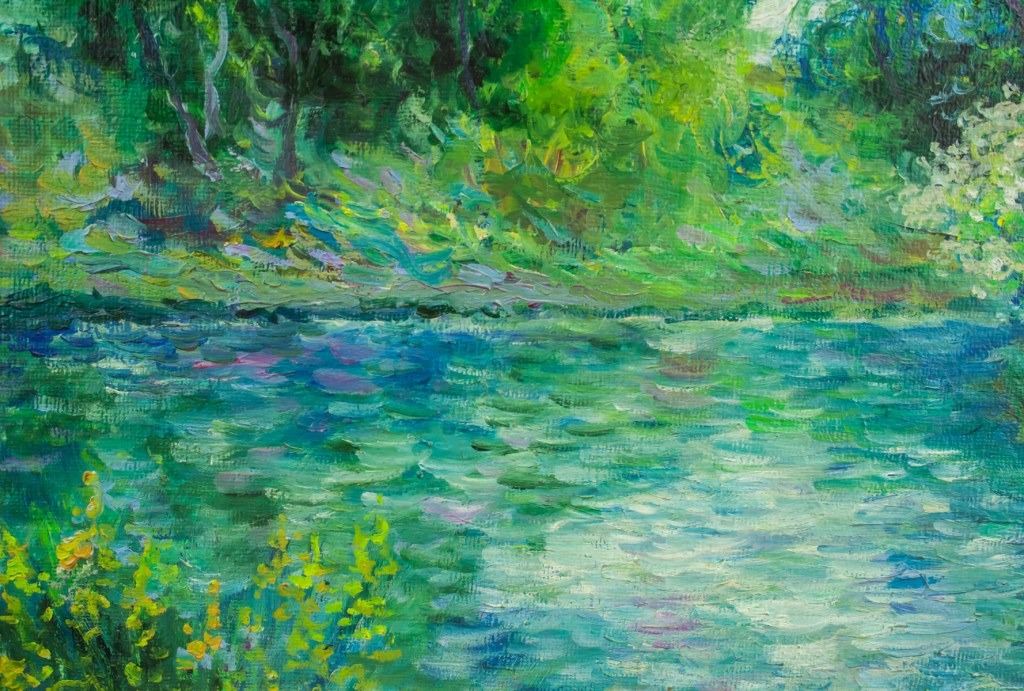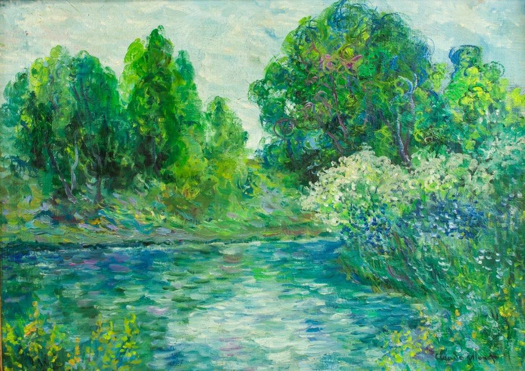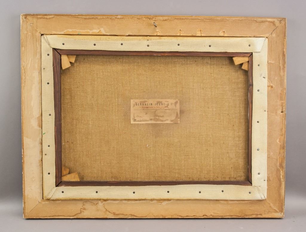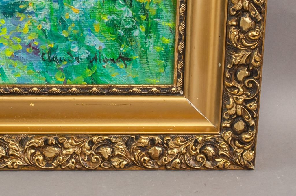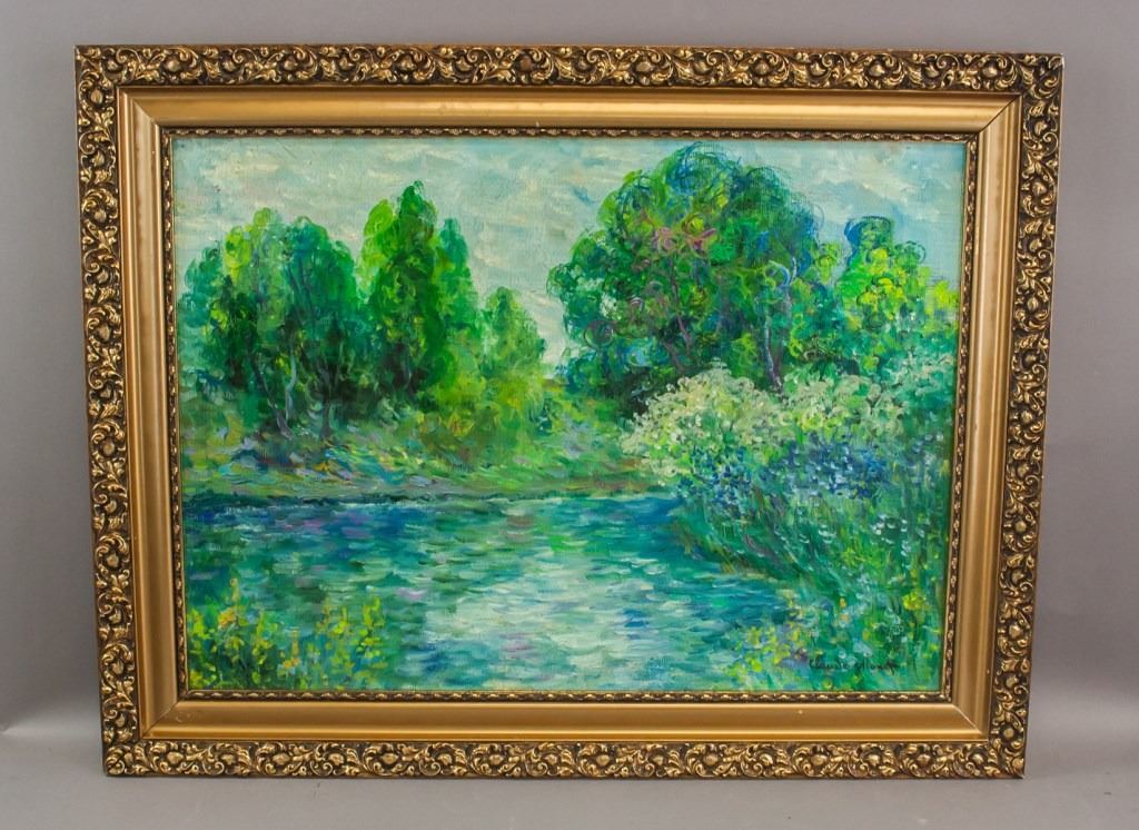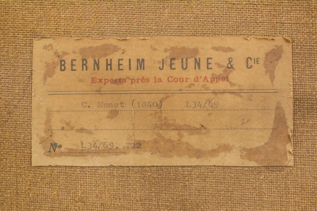 Oil on canvas, framed. Featuring impressionist landscape with pond. Signed "Claude Monet" to the bottom right corner. Label on verso reads "BERNHEIM JEUNE & Cie / Experts pres la cour d'Apped / C. Monet (1840) L34/69 / No L34/69, T22". 50.5 x 65.5 cm (19.9 x 25.78 inches).