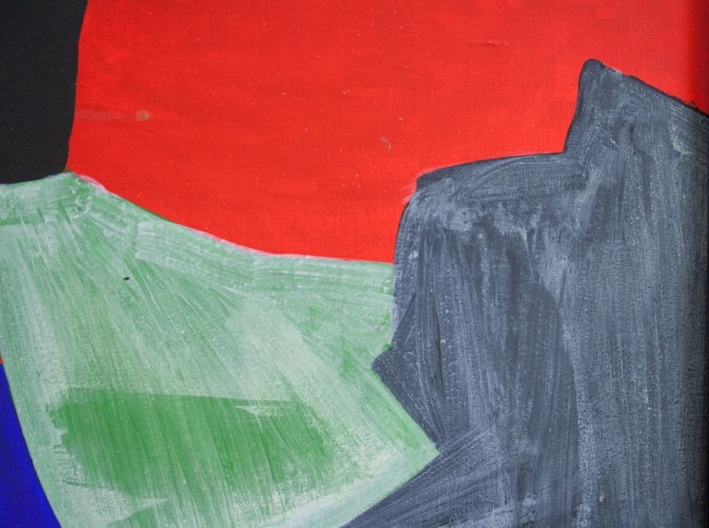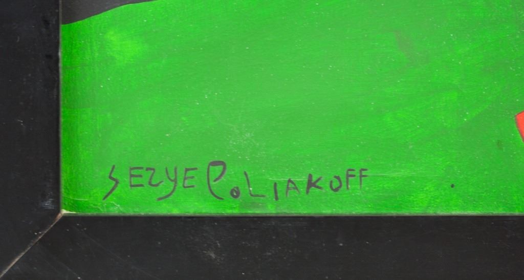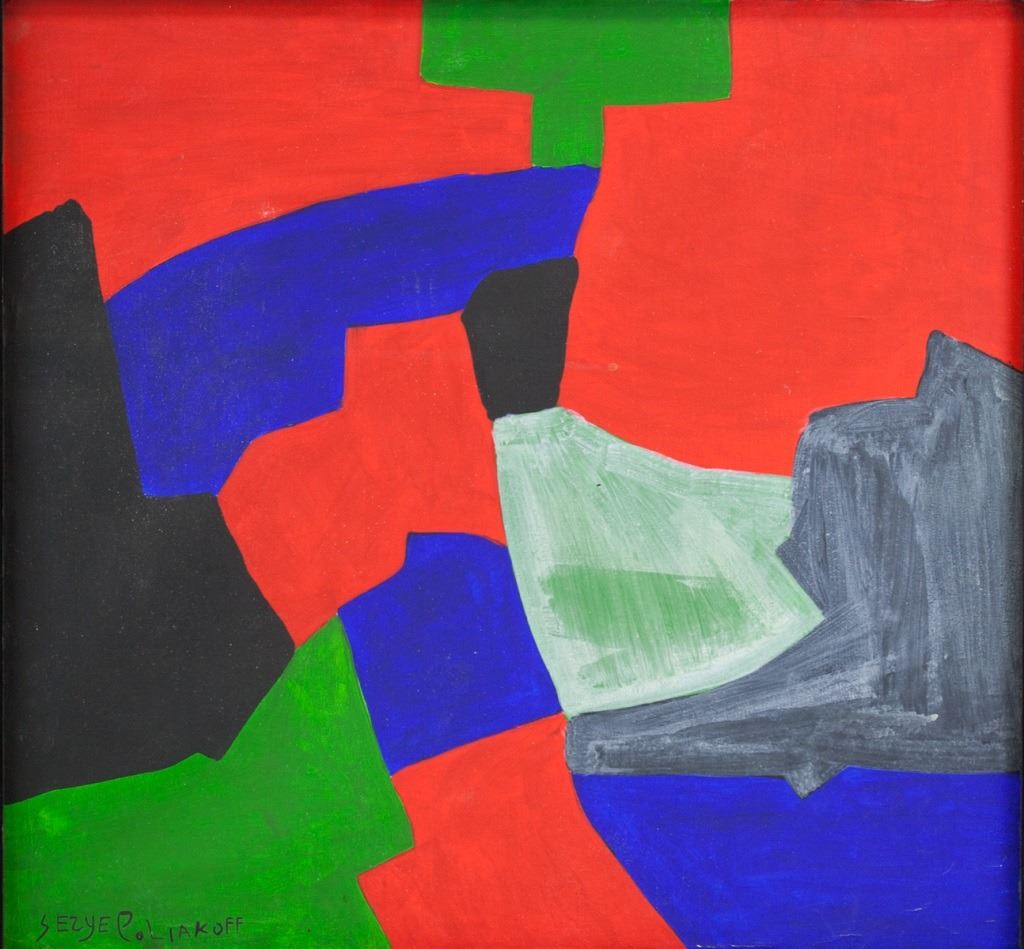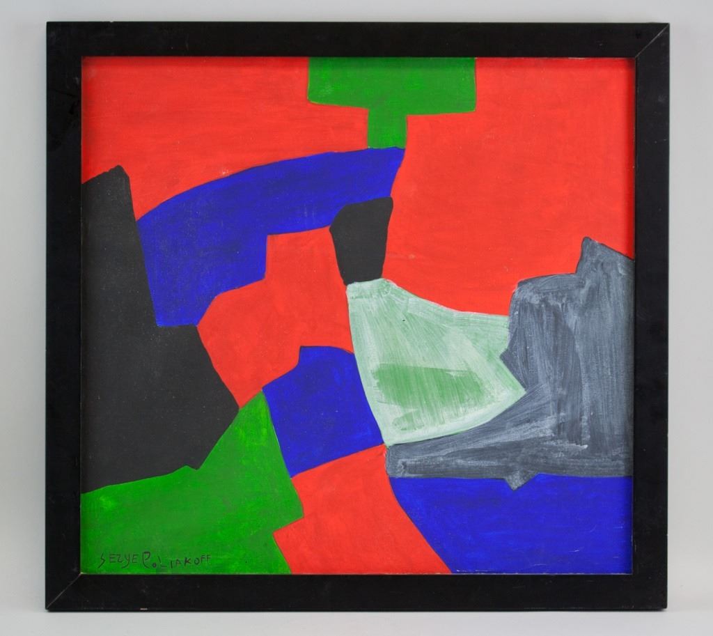 Oil on canvas, framed. Featuring abstract composition of a patchwork of colors. Signed "Srge Poliakoff" in the bottom left corner. Canvas size: 47 x 49 cm (18.5 x 19 inches). Frame size: 54 x 56 cm (21 x 22 inches).