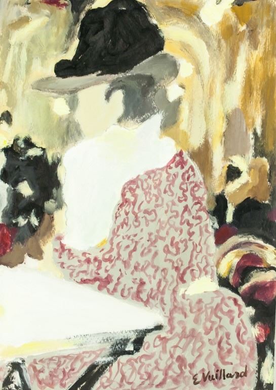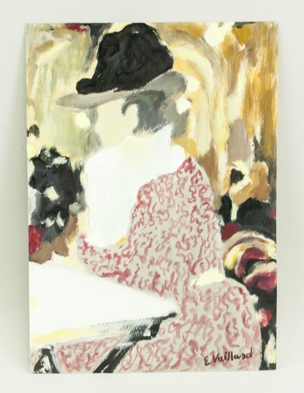 Oil on paper. Featuring portrait of a well-dressed woman in a black hat. Signed "E. Vuillard" to the bottom right corner. 30 x 21 cm (12 x 8.5 inches).
