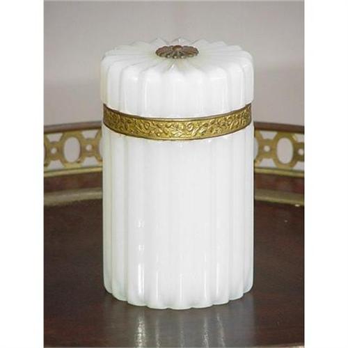 <table width="100%" border="0" cellspacing="0" cellpadding="4"><tr><td><em> </em></td></tr><tr> <td width="100%"> An early 19th century French opaline white round box, 4 1/2" tall, 2 7/8" in diameter. Gilt metal band, the top lifts off. The color is beautiful and the fluted design is finished with a gilt metal button finial. The condition is very good there are several minor chips on the underside of the box. </td></tr><tr> <td> </td></tr><tr> <td>Reference #: 5420_100</td></tr><tr><td>Condition:Good</td></tr><tr><td>Year:early 19th Century</td></tr><tr><td>Title:French Opaline Box SKU 5420</td></tr><tr><td>Location:Fort Lauderdale, Florida</td></tr></table>