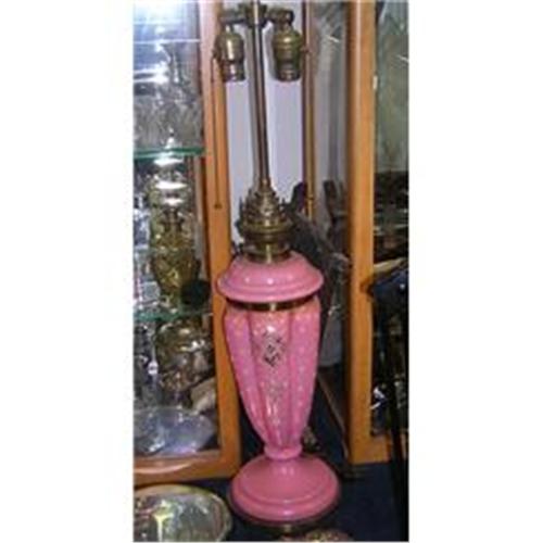 This pink French opaline glass lamp was originally an oil lamp that has been modified for electricity, with the original burner still in tact. The guilding and applied jewels are in acceptable condition for the age of the lamp-- .The lamp from the 1880's usable today but should be rewired. We welcome questions -and we have lowered the reserve quite a bit from what is stated.