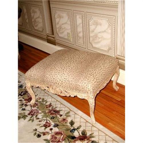 Wonderful C.1885 large,29L X 25W plumply stuffed leopard skin print linen Louis XV carved cream ottoman is sized for use as an oversized footstool or the 17.5 height perfect for seating or a coffee table with tray between a pair of sofas. Pierced carving on the scalloped aprons as well as the knees and cabriole legs. Recently reupholstered with the Ralph Lauren leopard linen and new sound interior which has double cording surrounding the outline. Excellent condition.
