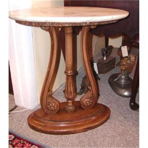 Adorable small oval table with great marble top. The marble is in perfect condition, no chips/crack. The table is a painted wood, there is some trim missing on the base, in two spots, one is about 2" long the other is around the curve and is also about 2", if you turn the table towards the wall you can't see them. It's a very cute side table. Other than that it's in very good condition.
