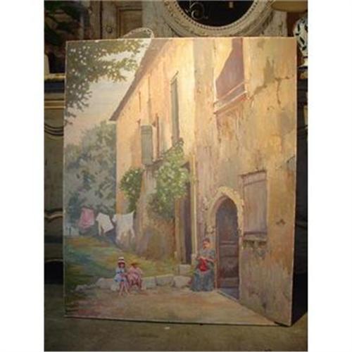 The painting depicts a wonderful French scene of a stone farmhouse with a mother tending to her knitting while her children are at play. it is great for any room of the home.