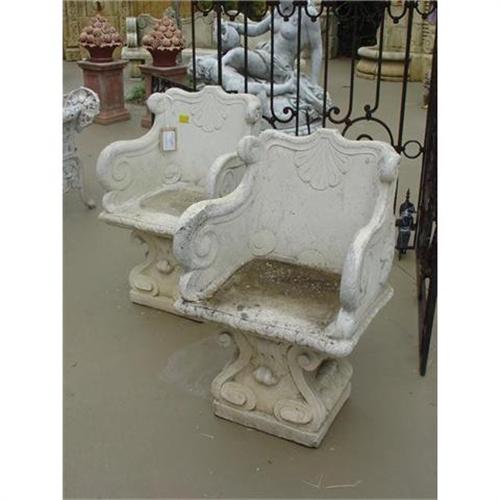 This pair of painted cast stone seats have a central shell motif on their backs and s-scroll arms. They rest upon a base with s-scrolls and acanthus leaf decor. The back of the chair has an elaborate acanthus leaf design extending to the sides of each chair.