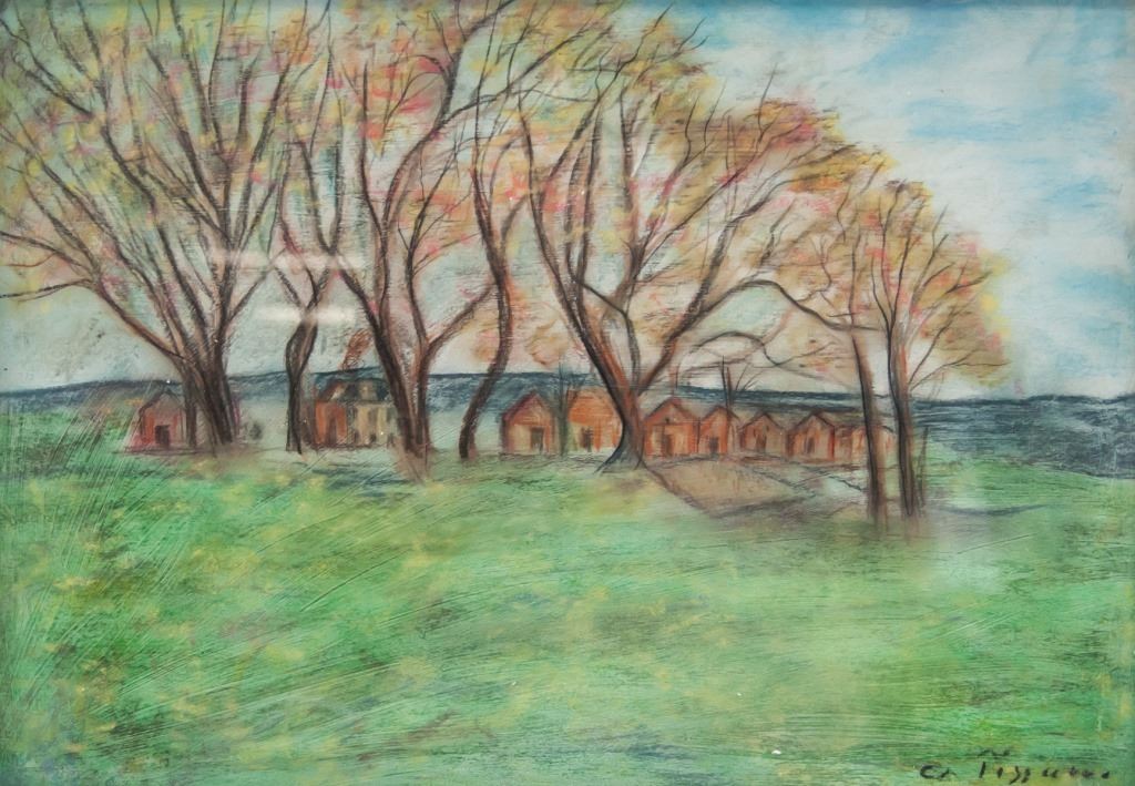 Pastel on paper, framed. Featuring landscape scene with a row of houses behind a row of trees. Signed "C Pissarro" to the bottom right corner. Label on verso reads "MATTHEW MARKS GALLERY / ARTIST: CAMILLE PISSARRO / TITLE: UNTITLED / MEDIUM: PASTEL ON PAPER / SIZE 19 1/2 X 13 1/2 IN. /YEAR 1889". Paper size: 33 x 48 cm (13 x 19.7 inches). Frame size: 42 x 62.5 cm (19 x 24.5 inches).