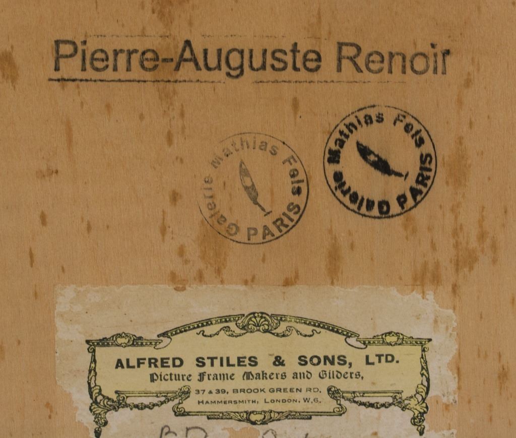 Pastel on paper. Featuring portrait of a woman holding a fan. Sighed "Renoir" to the top left corner. "Pierre-Auguste Renoir" stamped beneath image. "Galerie Mathias Fels PARIS" stamped beneath image. Label on verso reads "Exhibition arranged by the ART EXHIBITIONS BUREAU 23 Albermarle Street London W1". "Pierre-Auguste Renoir" and "Galerie Mathias Fels PARIS" stamped on verso. Sticker on verso reads "ALFRED STILES & SONS LTD". Paper size: 41 x 32 cm (16 x 12.5 inches). Frame size: 59 x 49 cm (23 x 19.5 inches). Provenance: This lot carries limited provenance from a Private British collection.