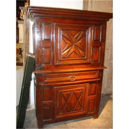 The moldings are of geometric pattern (pointe de gateau) within fielded panels. It has a projecting cornice which is repeated at the base, supported by 4 square wooden feet. The front has two doors and raised panels to either side. The doors are seperated by a single drawer, while the hardware is bronze.
