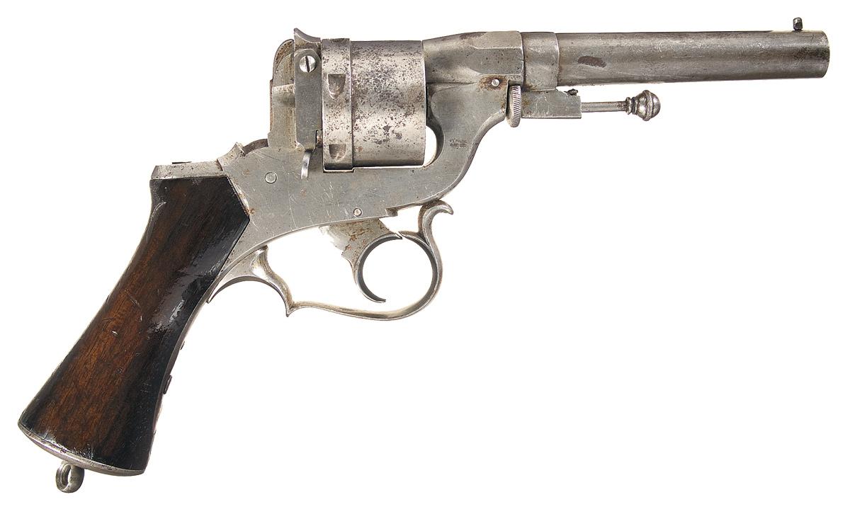 Patented in 1859, this double action French revolver was one of the first center fire revolvers. The cylinder is unfluted and has a capacity of six rounds chambered in 11 mm Perrin. The U.S. government ordered 1,000 of these revolvers and it has been considered a secondary martial weapon. The right front of the frame is marked "PERRIN / & Cie Bte", the left side is marked with the serial number over a dot over "PARIS". The only other visible markings are the serial number on the cylinder and underside of the barrel. The ejector rod is mounted on a swivel at the breech end of the barrel and slides into the cylinder pin when not is use. The hammer is without a spur and the grips are one piece smooth walnut with an iron butt cap and lanyard ring.