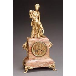 Having a two train movement striking on a bell, within a pink and white mottled marble case surmounted by a classical woman with putto. Movement with Japy FrÅres & Cie Medaille d'Honneur medallion and impressed numerals. Overpainting to gilding.