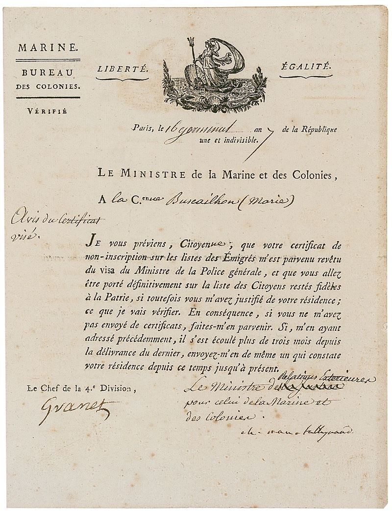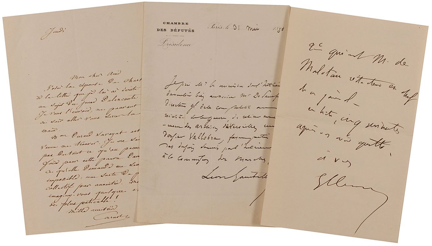 Collection of five items signed by noted French politicians, including: Charles Maurice de Talleyrand (DS), Guillaume Guizot (ALS), Georges Clemenceau (ALS), Leon Gambetta (ALS), and Marie Francois Sadi Carnot (ALS). In overall very good to fine condition.