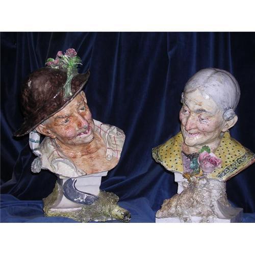 Bust of rustic commoners that are extremely detailed. The bust are French and are made of tin glazed porcelain. The woman has her hair in a bun and the man has a flower on his hat and a dagger around his neck. The bust have a couple of small chips. The bust are on 7 1/2" bases. The bust are sold as a pair.