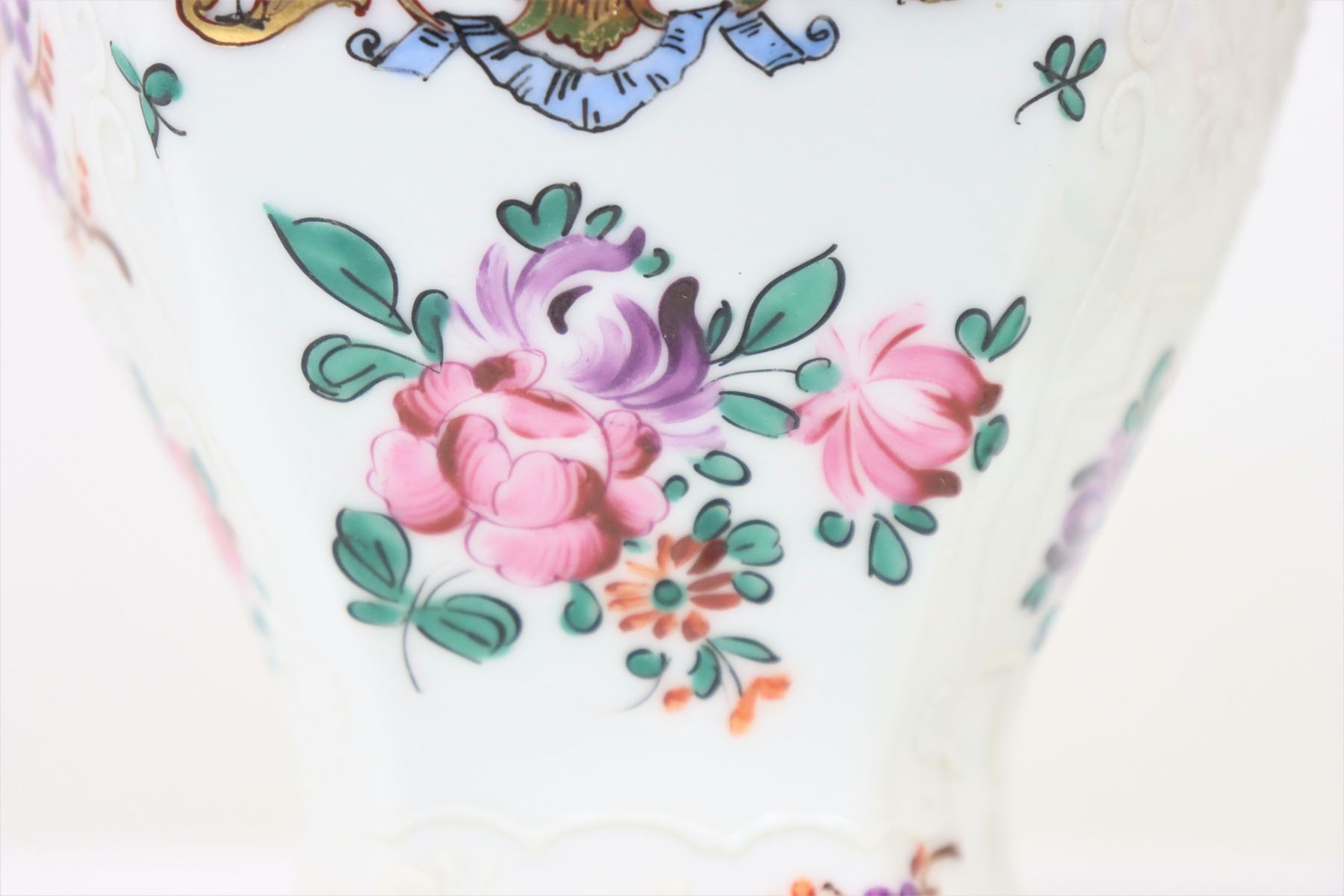 French porcelain urns/ginger jars with floral design featuring a crest with lions on either side. Made in France on the underside.