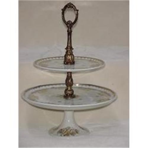 A two teir porcelian cake or dessert stand,15'' tall, 11'' diameter, hand painted, brass mounts. Made in France.