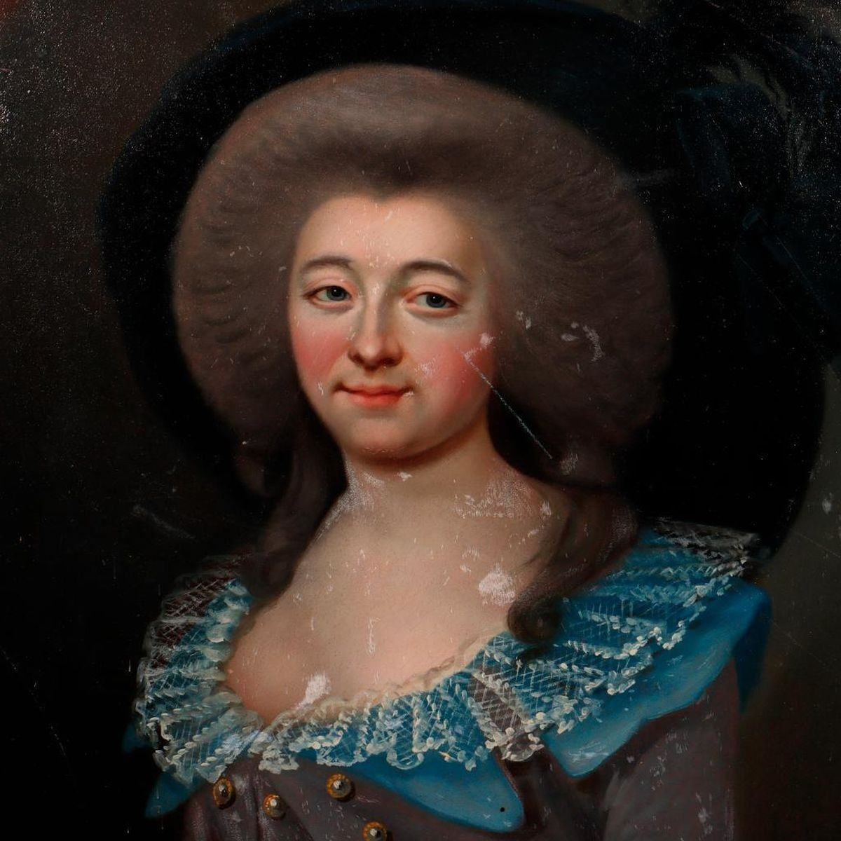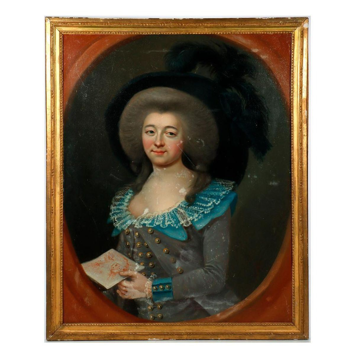 Artist: Unknown. Title/Subject: Lady in black feathered hat. Handwritten label on verso. difficult to read: "Jeanne Pierrette Mary------?", wife of "Griey?(z?) Mecru---?". Size: 31 1/4in x 25in; 33 1/2in x 27in (frame). Year Created: c. 18th/19th century. Signature: Unsigned. Medium/Ground: Oil on canvas. Condition: In-painting, surface losses, scuffing/scratches; losses to frame. (SEE PAIR: Portrait of a wigged gentleman). Condition Report: All lots are sold as is and where is. Turner Auctions + Appraisals, LLC provides condition reports upon request to aid in your bidding decision. No statement regarding age, condition, kind, value, or quality of a lot, whether made orally at the auction or at any other time, or in writing in this catalog or elsewhere, shall be construed to be an express or implied warranty, representation, or assumption of liability. All sales are final, Turner Auctions + Appraisals, LLC does not give refunds based on condition. Turner Auctions + Appraisals, LLC does not perform any shipping or packing services. We do have a list of suggested shippers who gladly provide quotes prior to your bidding. Please visit our webpage for a list of recommended shippers.