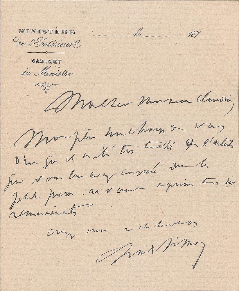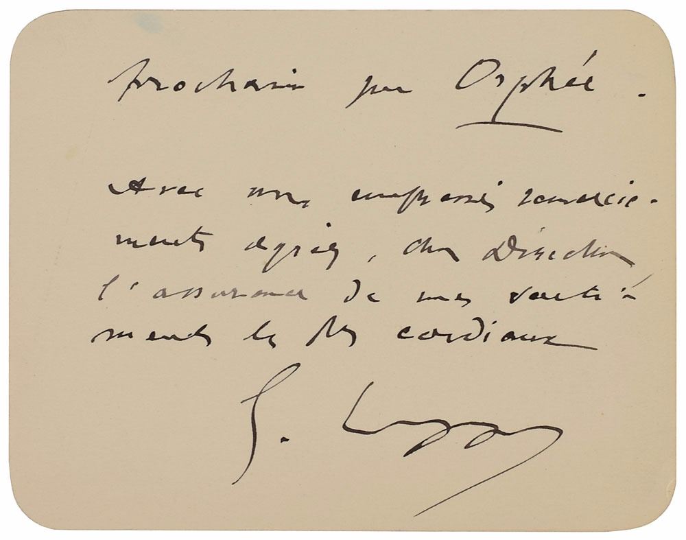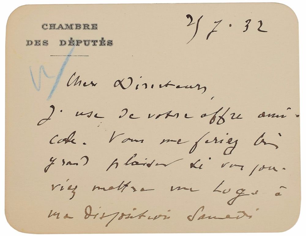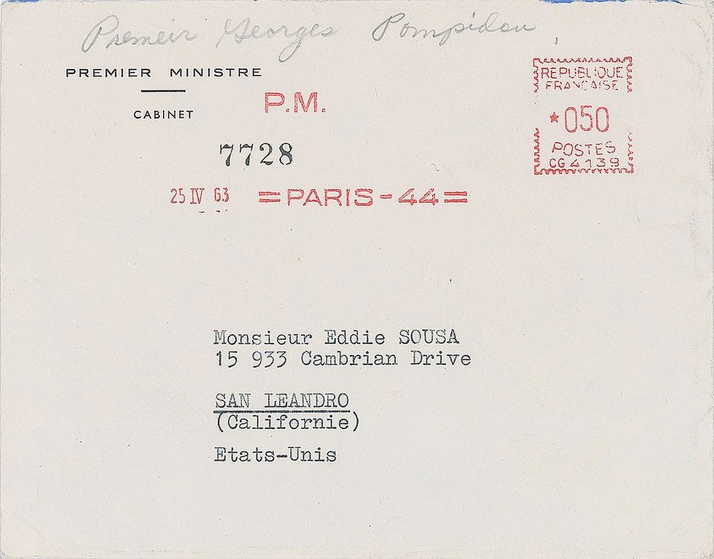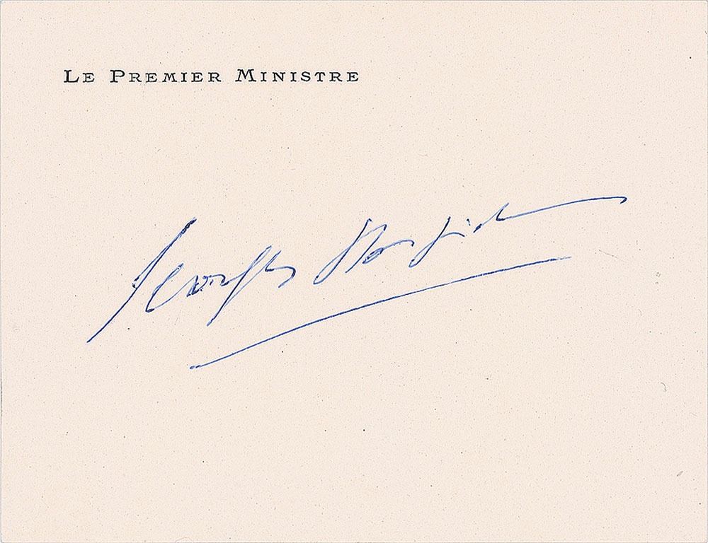 Three autographs of prime ministers of France, including: Jules Simon (ALS), Georges Leygues (ALS), and Georges Pompidou (signature). In overall fine condition. Accompanied by the original mailing envelope for the Pompidou signature.