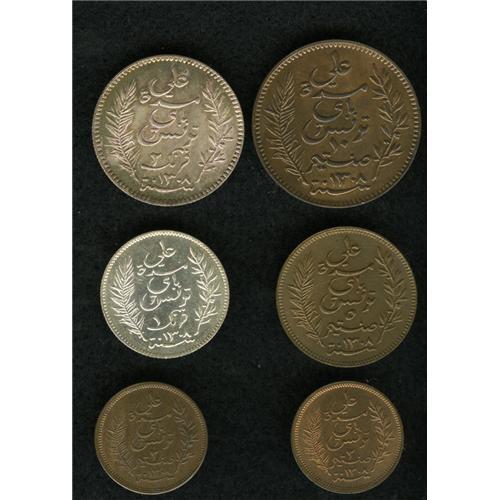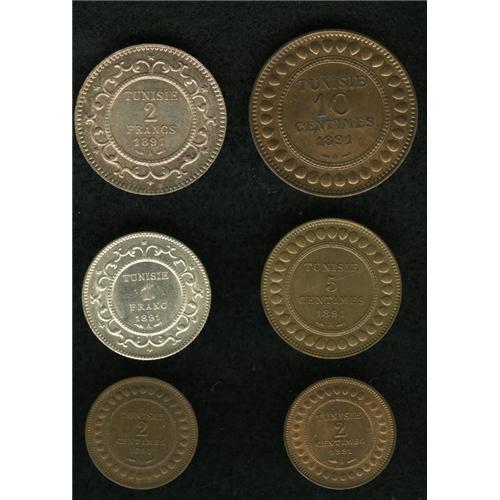 <B>French Protectorate Denomination Set, </B></I>six coins, all dated 1891, struck at the Paris Mint in the first year of the new coinage for the Protectorate and the local governor, Ali Bey. KM220 2 Centimes, two examples, toned AU and brilliant UNC, one year type, KM221 5 Centimes, lightly cleaned UNC, KM222 10 Centimes, XF, harshly cleaned long ago and now toned, KM224 Franc, lustrous AU, minor surface marks, and KM225 2 Francs, choice lightly toned UNC, very attractive and scarce in this premium quality. <B>Sold as is, no return lot.</B></I>