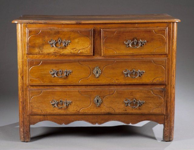 A French Provincial commode with shaped apron. Mid 19th century. 32 1/2"h x 43"w x 21 3/4"d.