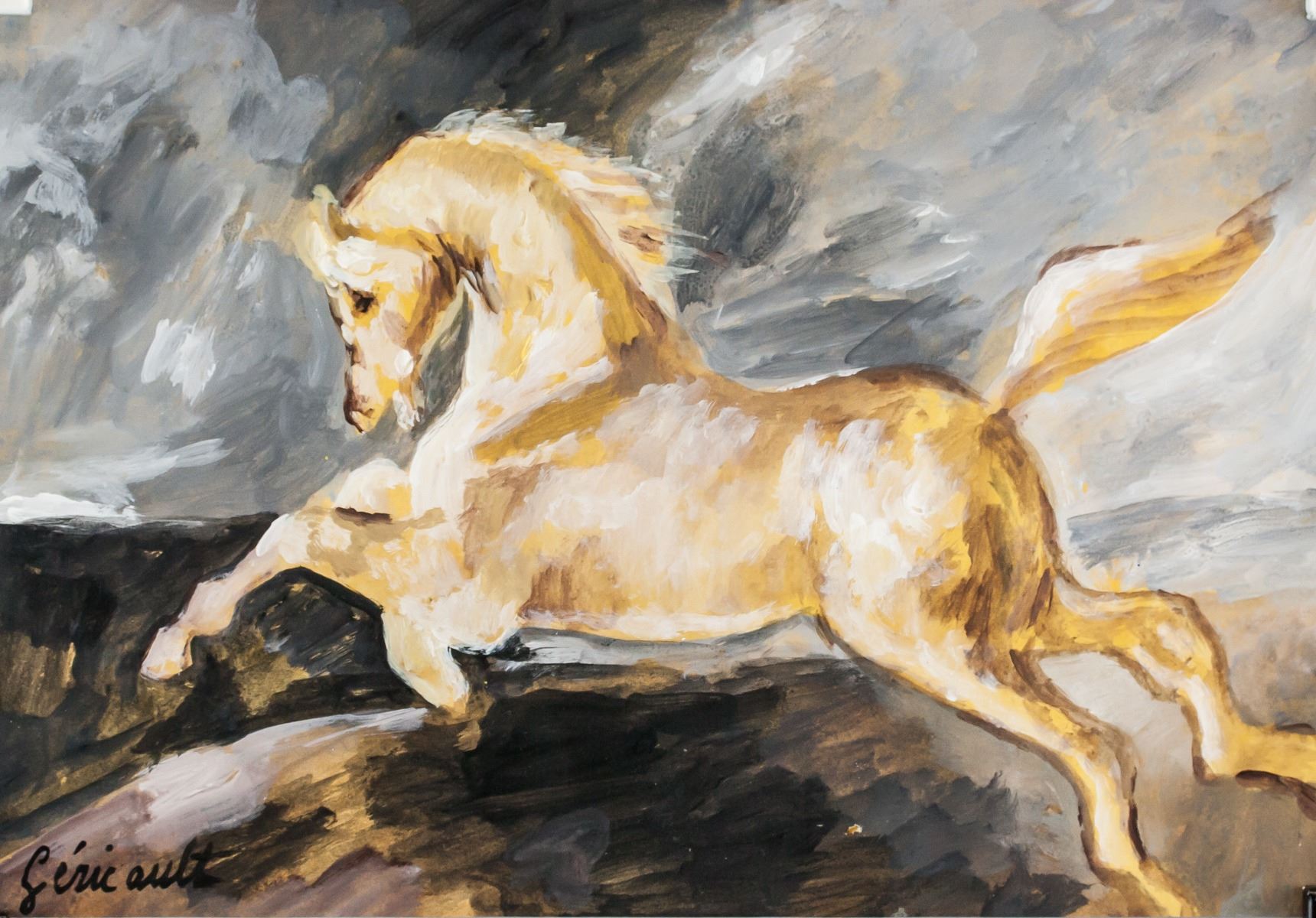 Gouache on paper. Featuring a portrait of a horse. Signed Gericault on the lower left corner. Inscribed INV67 on verso. Inscribed Theodore Gericault #57 in pencil on verso. Stamped F. Wiegand on verso. After Theodore Gericault (1791-1824, French). 20 x 28 cm (8.0 x 11.25 inches). PROVENANCE: Southern Ontario estate