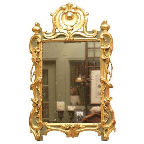 The shaped rectangular frame topped with an openwork rocaille crest flanked by ball finials above intertwining foliate branches and scrollwork, all relief-carved and gilded against an incised sage green ground.