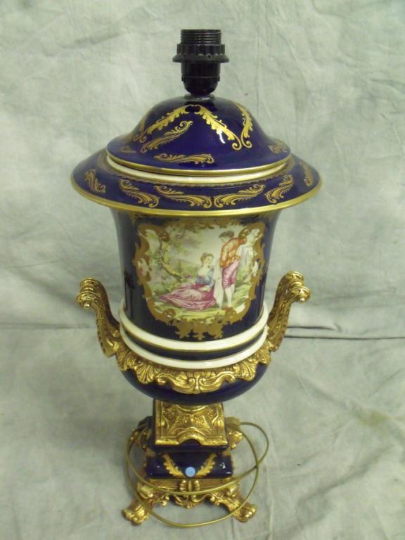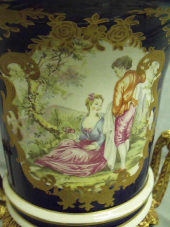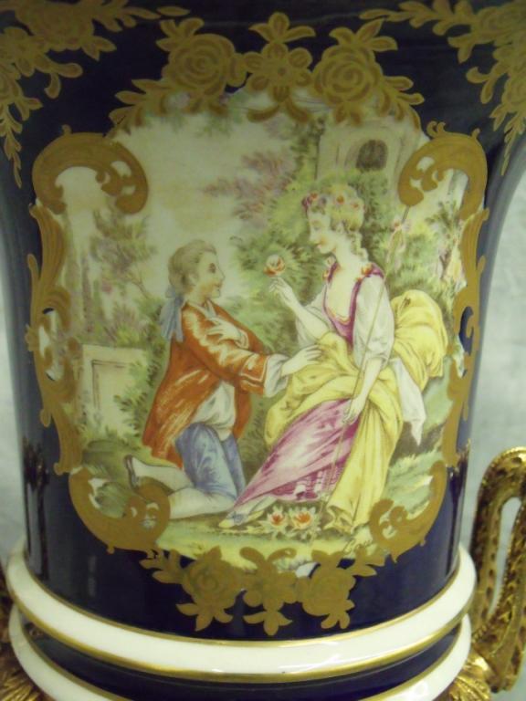 Finished in blue du roi color, with 22 karat scroll work. Has bell shape main body with painted panel of 18th century couple in formal provential classical attire. Has serpantine double handles, has deeply engraved cast bronze base raised on
