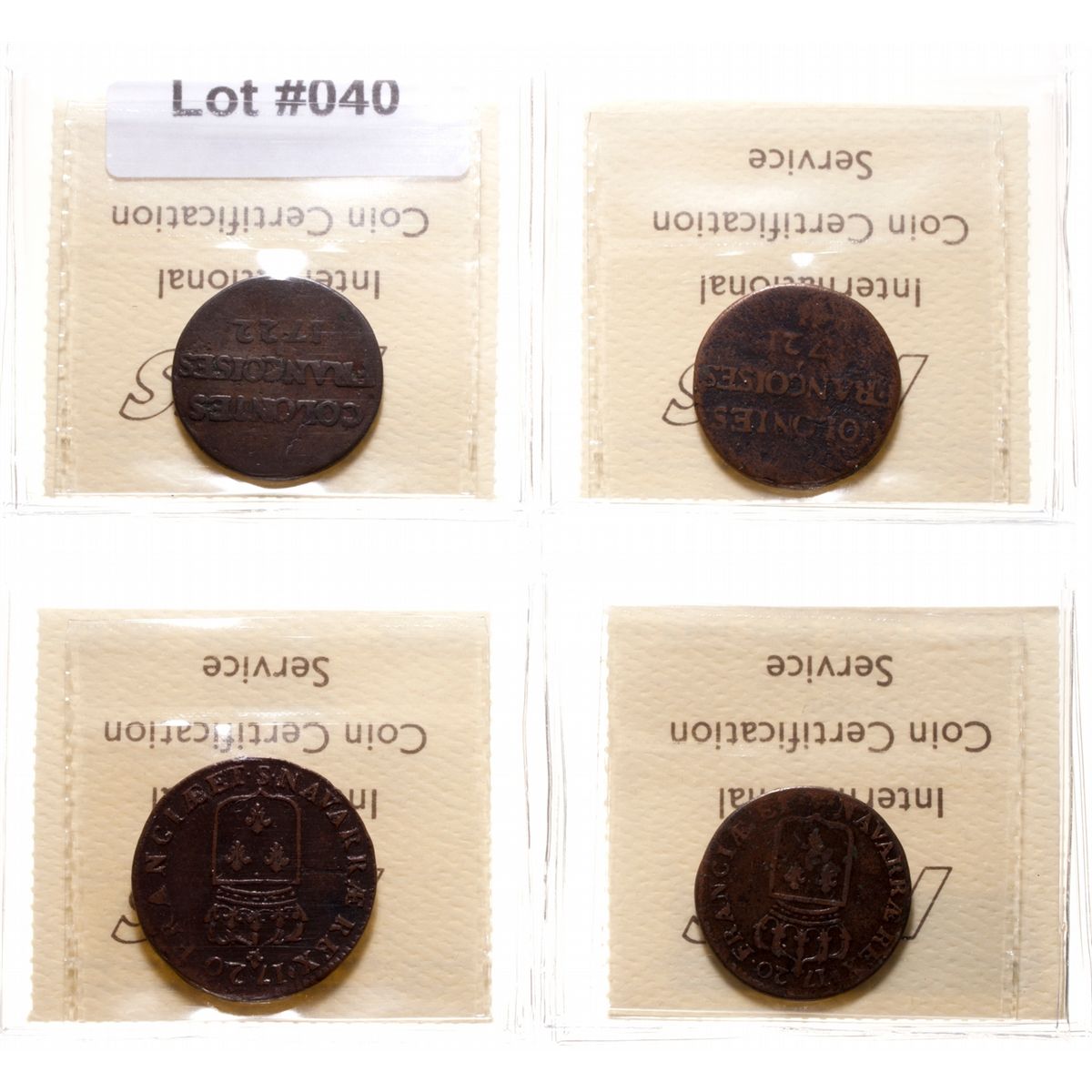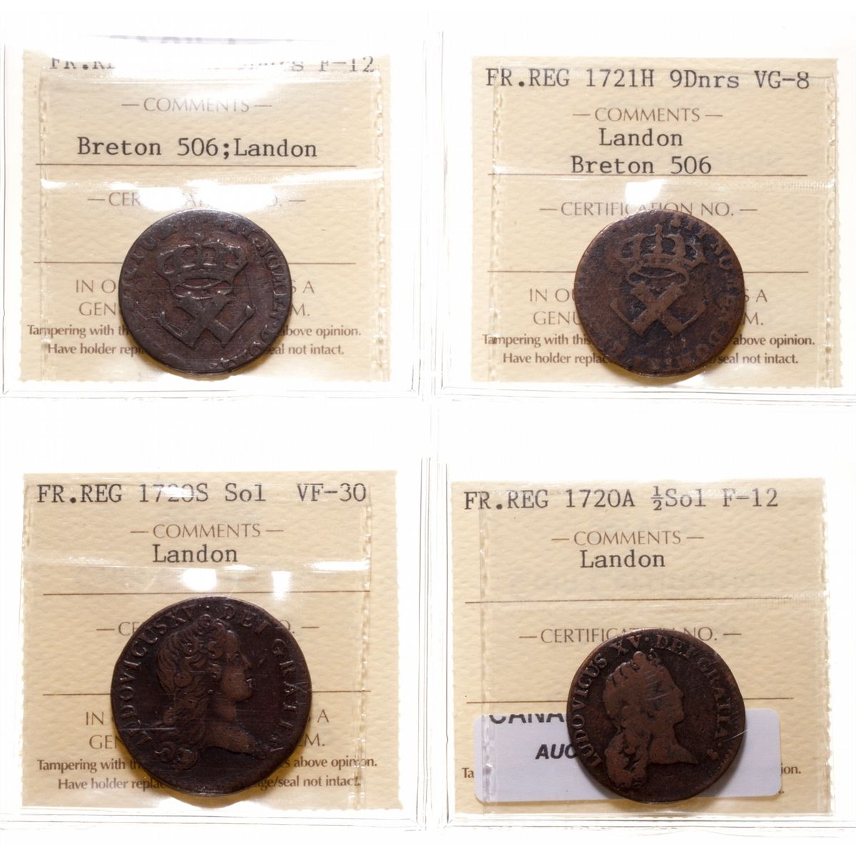 French Regime. 1/2 Sol. 1720-A. ICCS Fine-12; 1 Sol. 1720-S. ICCS VF-30; Breton-506. 9 Deniers. 1721-H. ICCS VG-8; Breton-506. 9 Deniers. 1722-H. ICCS Fine-12. Lot of four (4) tokens.