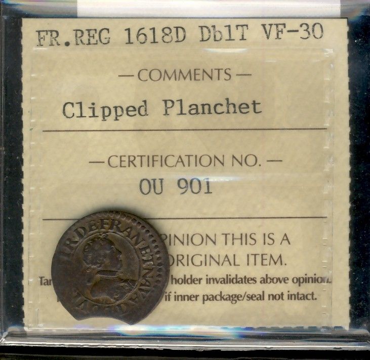 French Regime; 1618D DblT ICCS VF30. Clipped planchet.