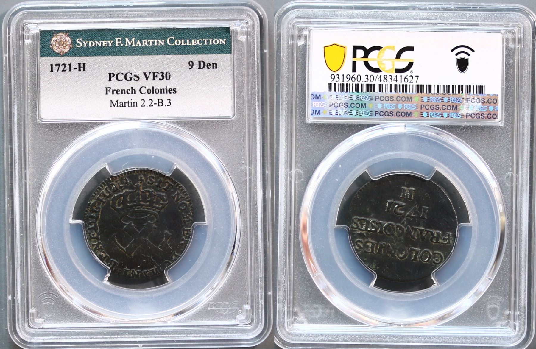 French Regime; 1721-H French Colonies 9 Denier PCGS Choice Very Fine-30.