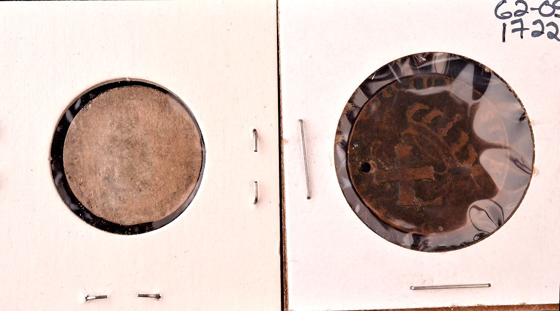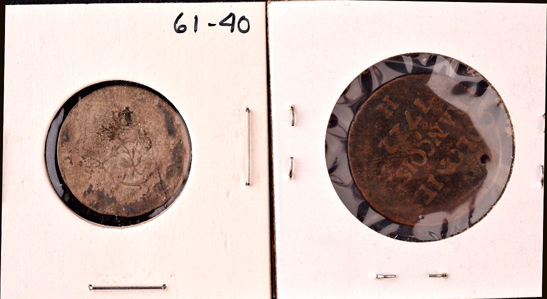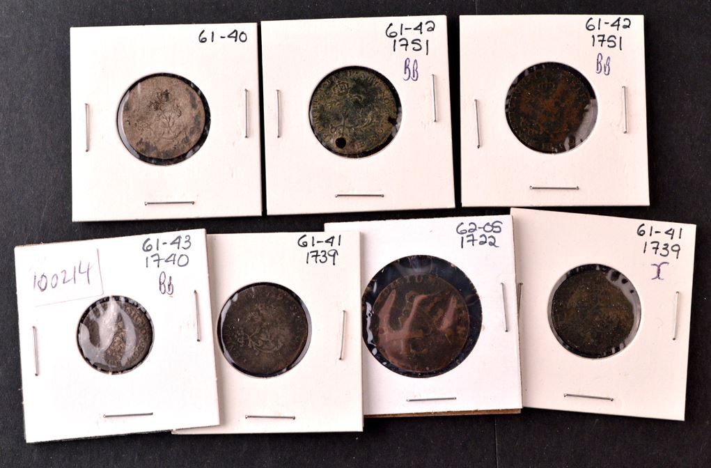 French Regime, 9 Deniers, 1722H, Fine, holed; Un Sol, 12 Deniers, 1740BB, VG, small crease; Double Sol, 24 Deniers, 1739, (2); 1751, Contemporary Ctft., (2), one holed; another badly worn, no date; all low grade; total of 7 coins.
