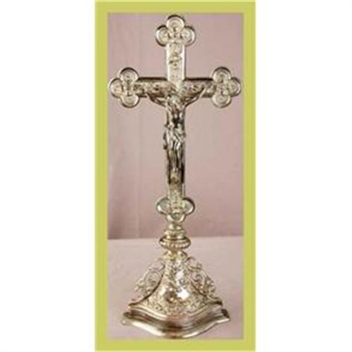 French Religious Crucifix Standing Ornate Jesus Nickel-plated Origin: France Material(s): Nickel-plated Style: Religious Age: 1930 Misc. Details: Standing Subject: Ornate Jesus Comment: This very ornately cast and beautiful standing crucifix will bri