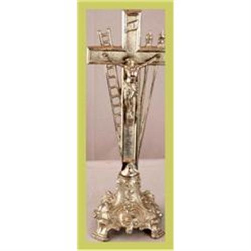 French Religious Crucifix Standing Swords Longinus Ladder Ornate Nickel-plated Origin: France Material(s): Nickel-plated Style: Religious Age: 1950 Misc. Details: Standing Subject: Swords Longinus Ladder Ornate Comment: An unusual and ornate design w