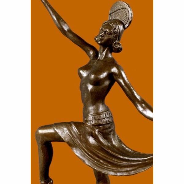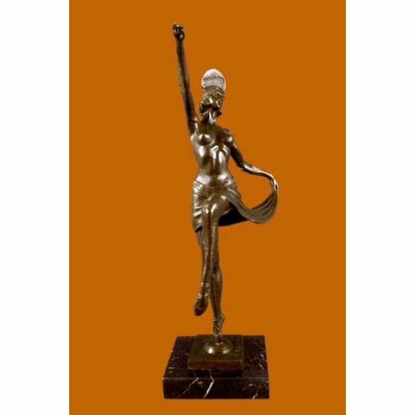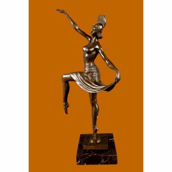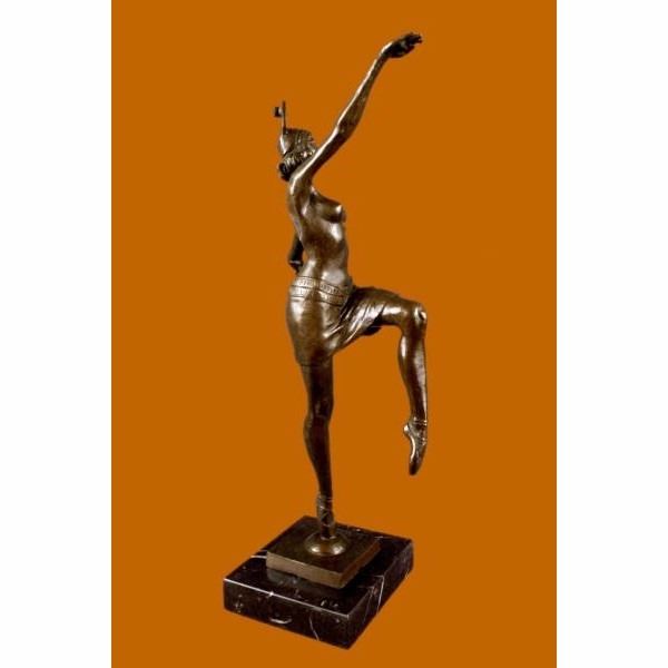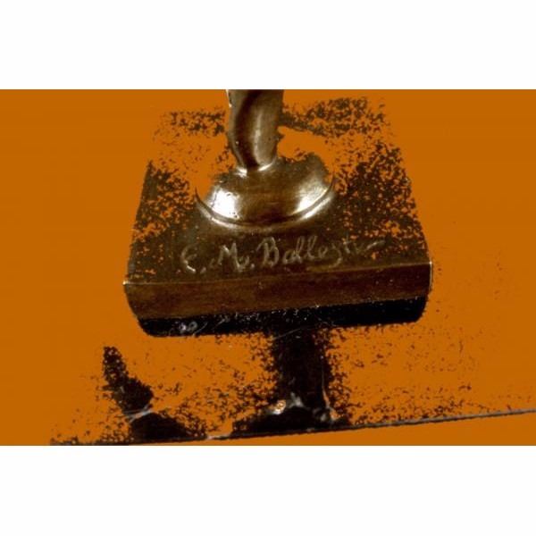 This spectacular early 20th c French reproduction bronze was made by Henri (Enrique) Molins-Balleste (1893-1958). It depicts an iconic Art deco dancer in motion with one of her legs kicked upward and one hand to each side. The nude dancer wears only an undergarment, yet exhibits such grace in her movement. Notice the fine detail to her face and the subtle muscular definition of her body - her stomach, knees, back and spine. Her bobbed hairdo is certainly reminiscent of the Flapper style. The bronze is patinated with a handsome brown color. The sculpture is further enhanced by the tiered square base, combining black marble . The piece is signed on the base Balleste Condition: This sculpture is in perfect condition. Bronze Dimensions with Marble Base:Height 16" x Width 10" Marble Dimensions:5" X 5" Height without base: 15" Weight :8 LBS Inventory : 18XNCH1928B7581