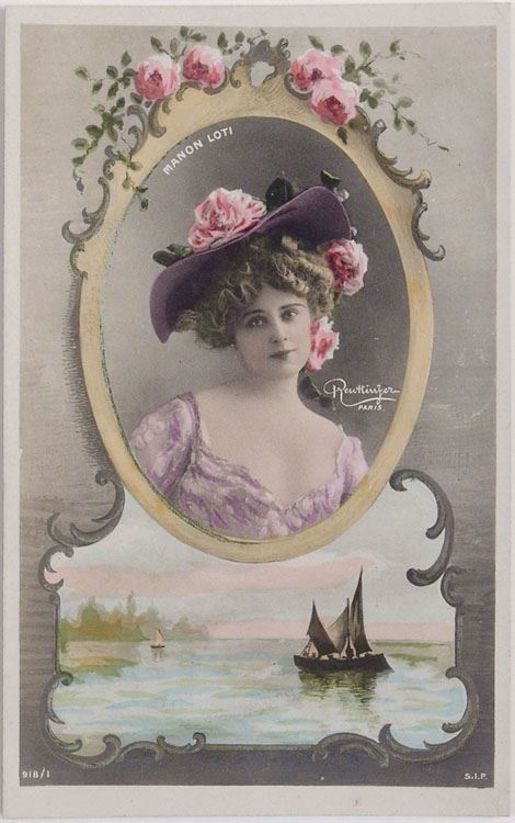 This is a beautiful antique hand-colored real photo Belle Epoque postcard from France. Photograph of actress Manon Loti by Reutlinger, Paris. SIZE: Approx. 3 1/2" x 5 1/2". You'll find more lots of Reutlinger and other real photo postcards in this catalog.