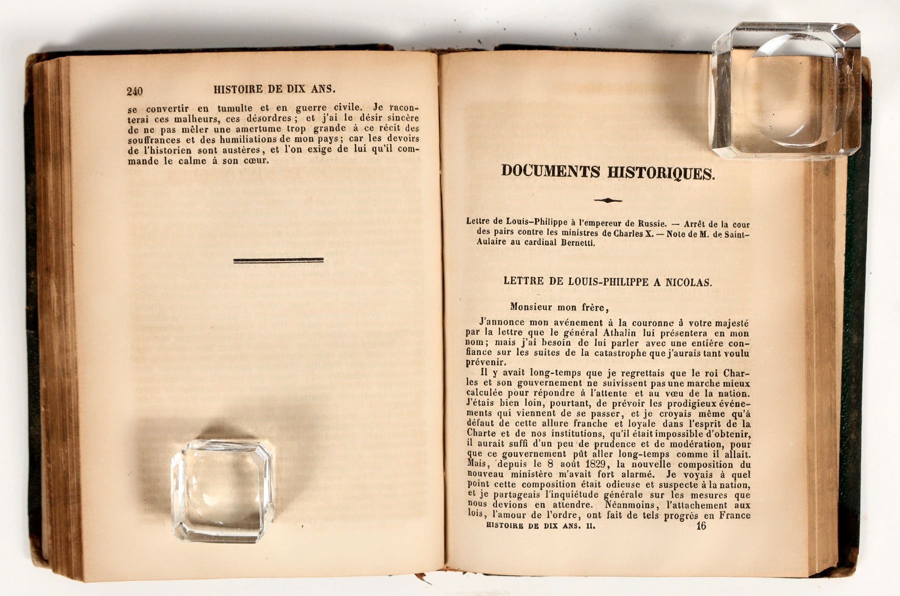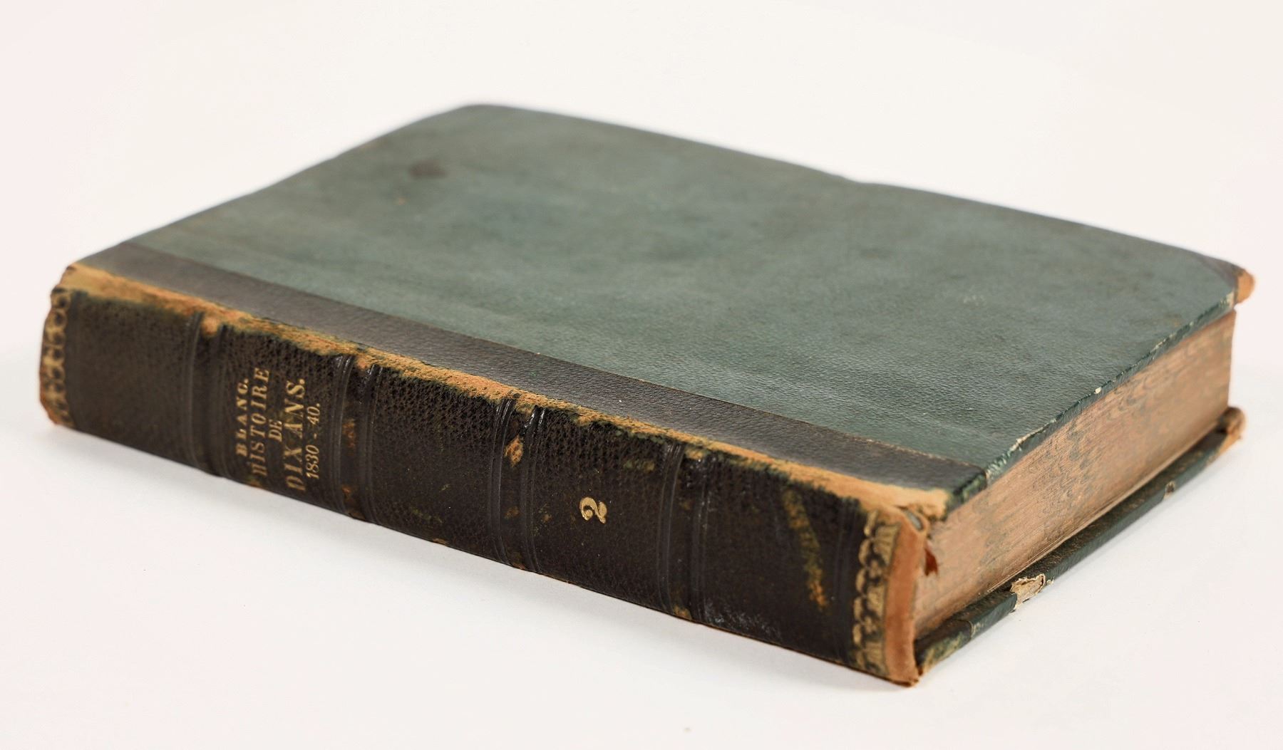 Published in 1844, French Revolution History of Ten Years. Hardbound, 451 pages, written in French. Outside cover shows age and slight wear, but is intact and not separated. Pages show age discoloration.