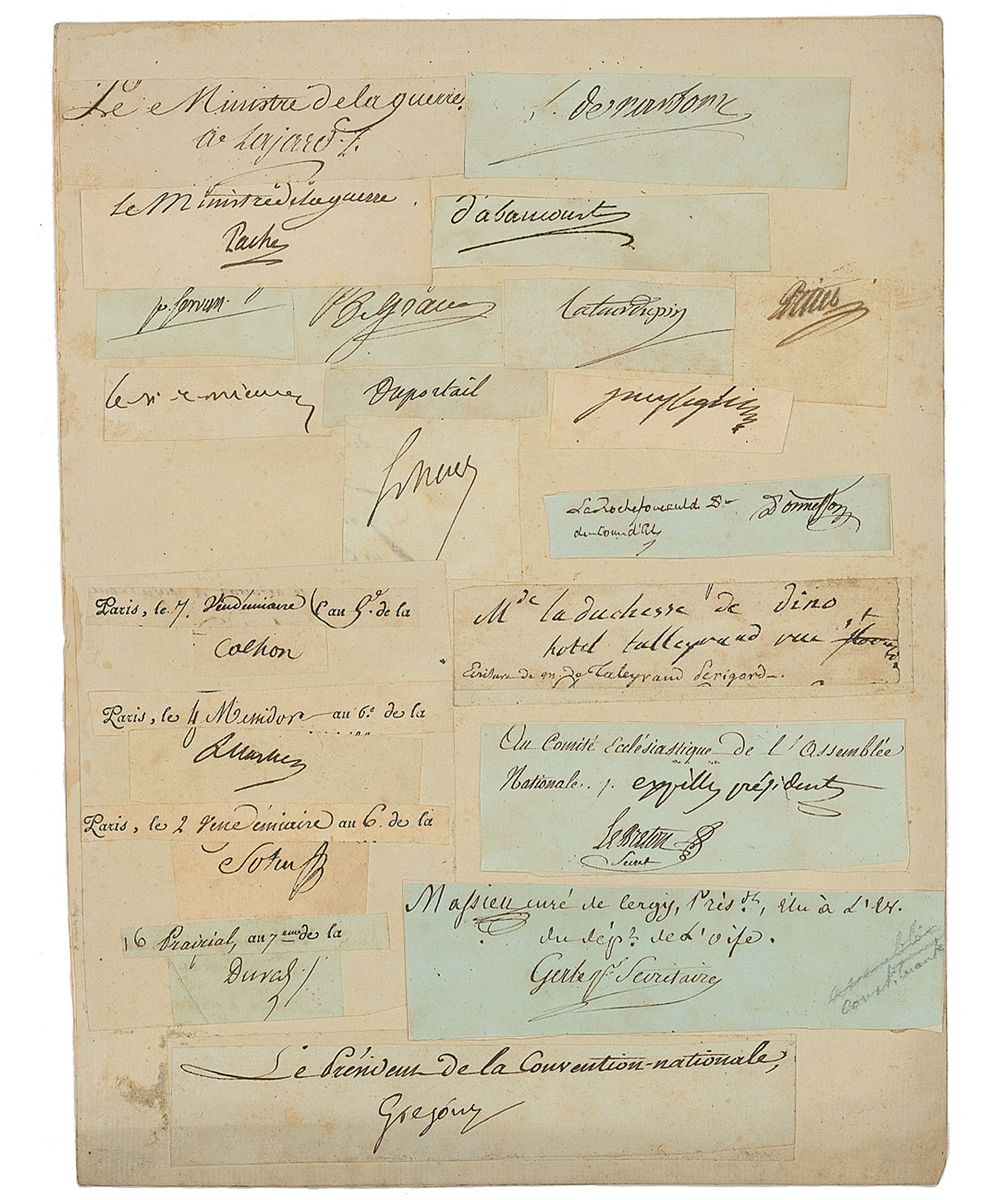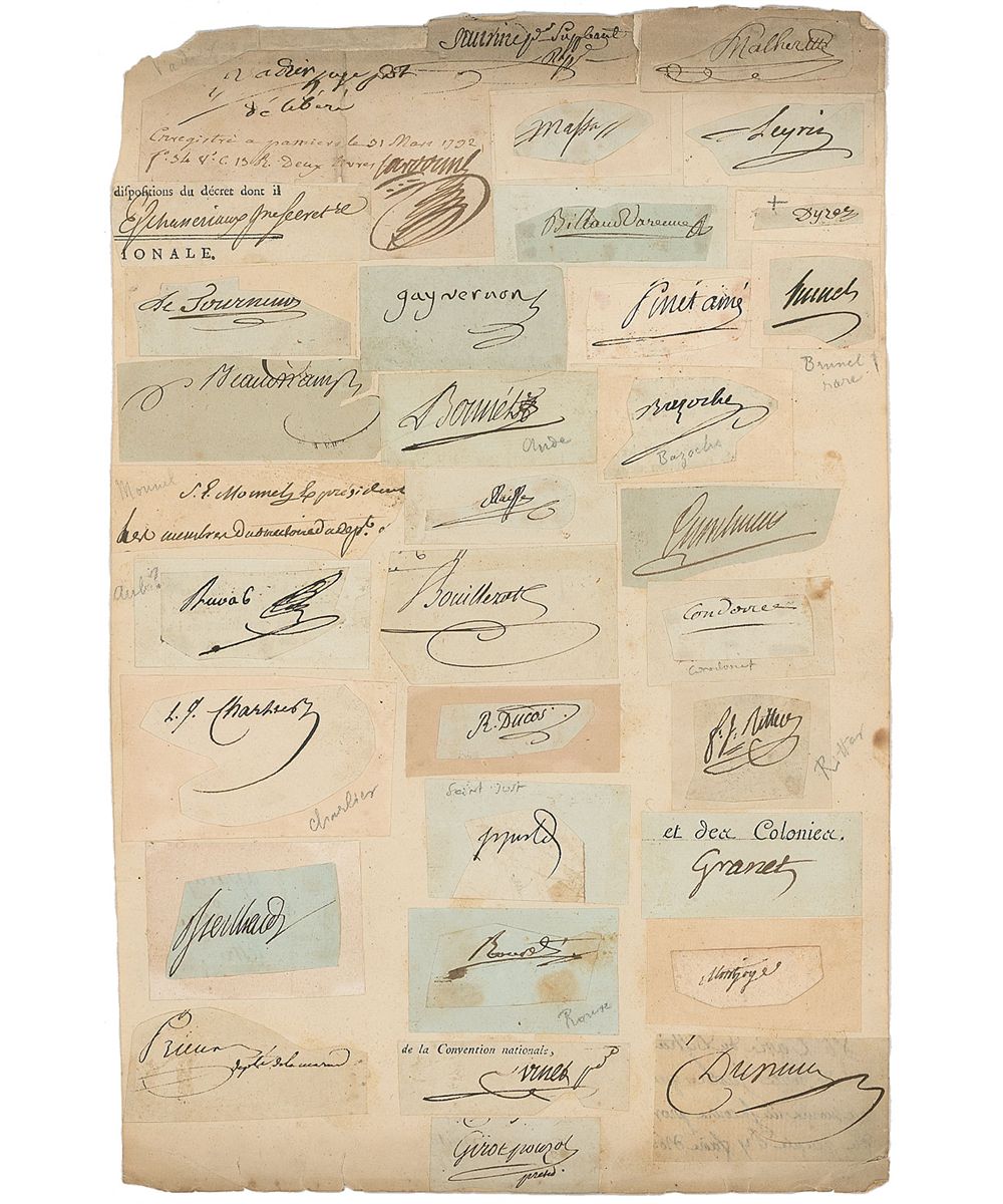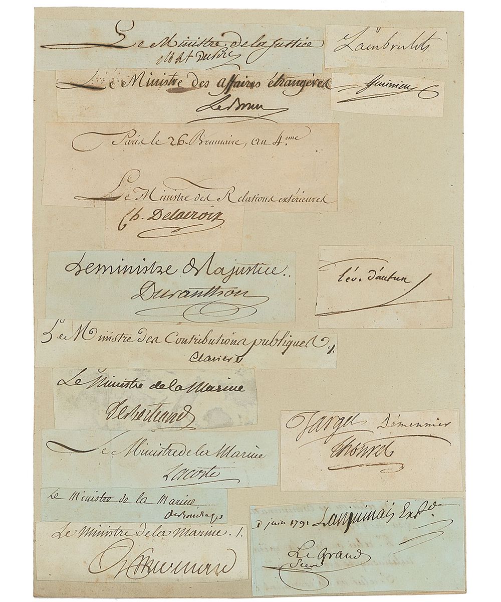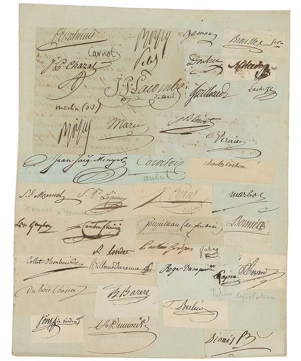 Large collection of 109 ink signatures of important figures from the French Revolution on individual slips, affixed to five sheets of various sizes, including: Brunel, Charles Delacroix, Jean-Marie Roland, Dominique Joseph Garat, Jules-Francois Paré, Louis-Joseph Charlier, Bertrand Barère, Jean-Marie Collot d'Herbois, Charles Cochon de Lapparent, Charles Maurice de Talleyrand-Périgord, and the very rare signature of Saint-Just. In overall very good to fine condition.
